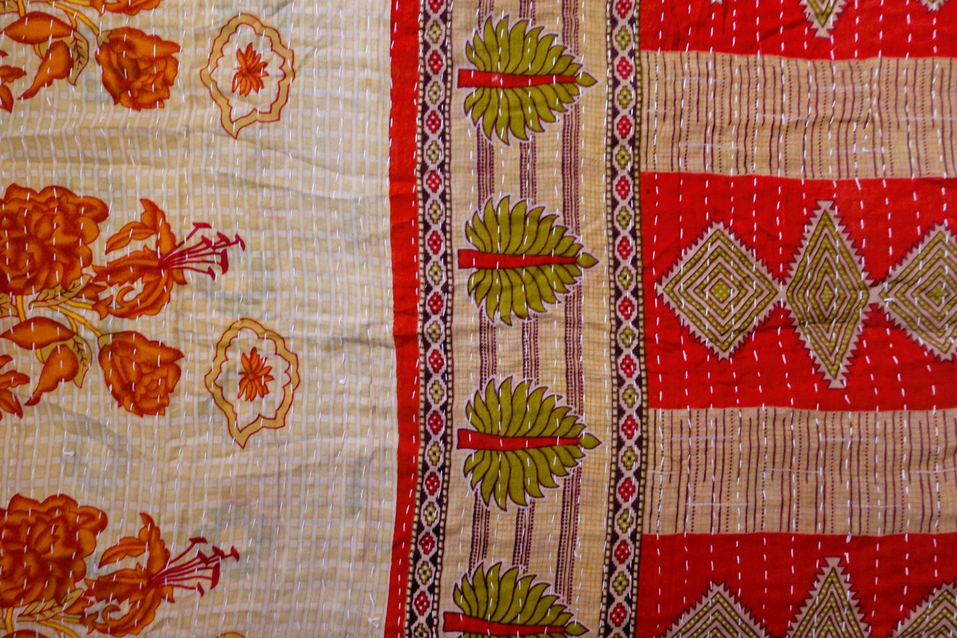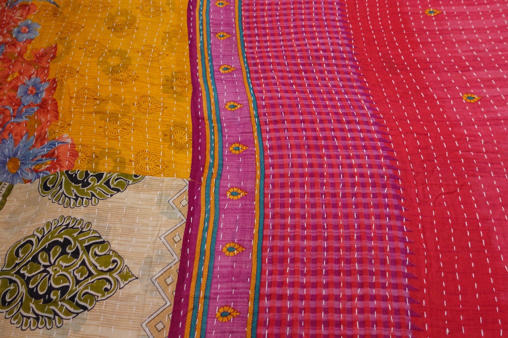 Beautiful, colourful Kantha throw made from recycled vintage saris sewn together with an all over running stitch.