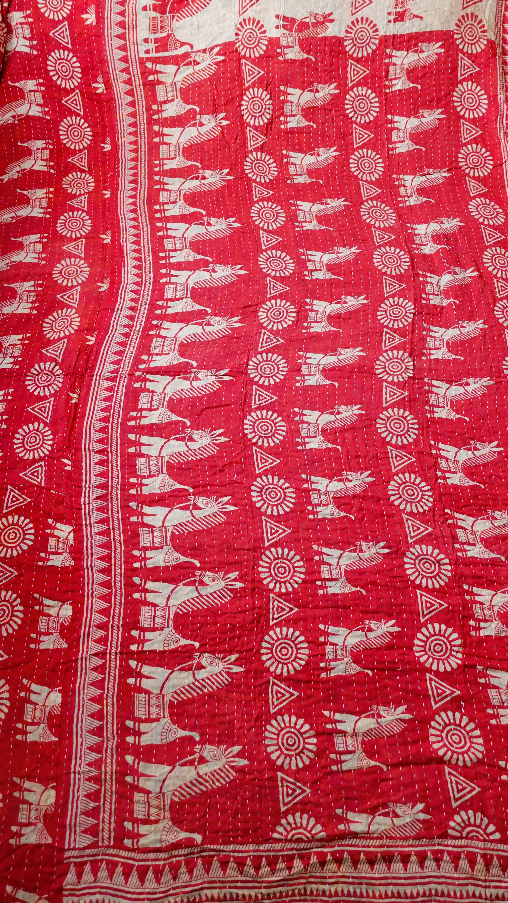 Layers of soft worn sari makes an attractive unique and cosy throw; great for any bed, sofa, campervan, etc.