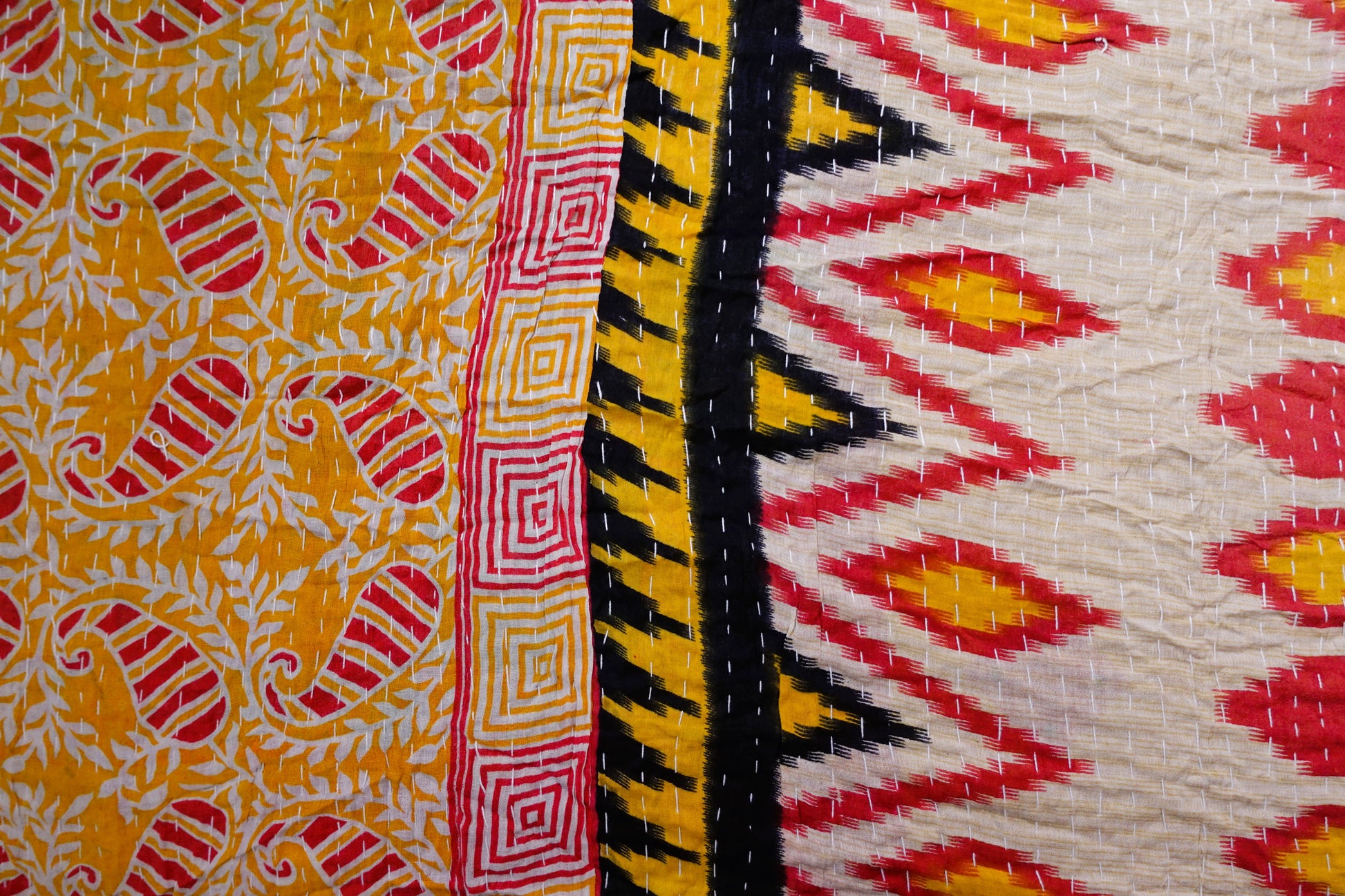 Beautiful, colourful Kantha throw made from recycled vintage saris sewn together with an all over running stitch.