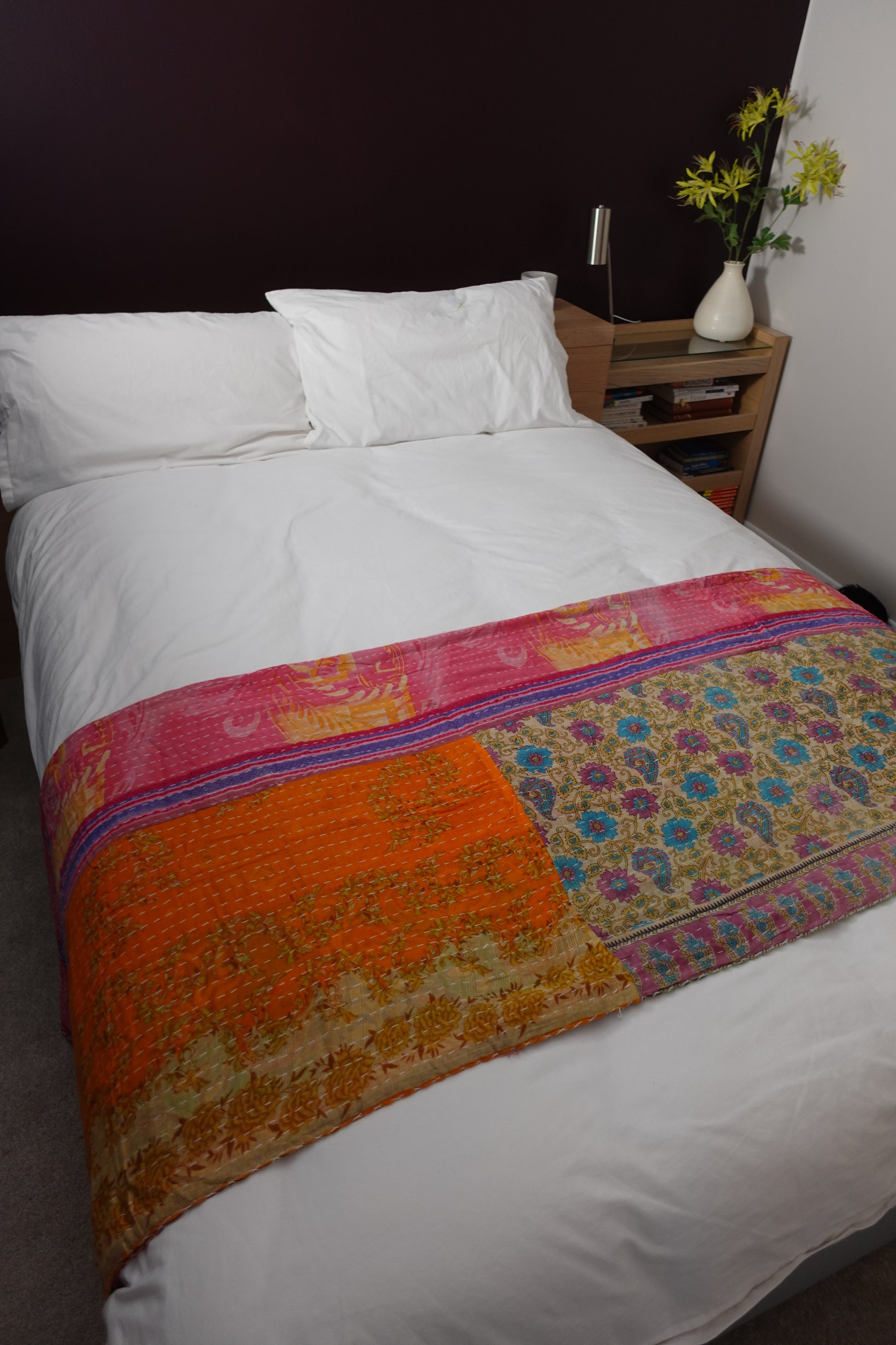 Layers of soft worn sari makes an attractive unique and cosy throw; great for any bed, sofa, campervan, etc.