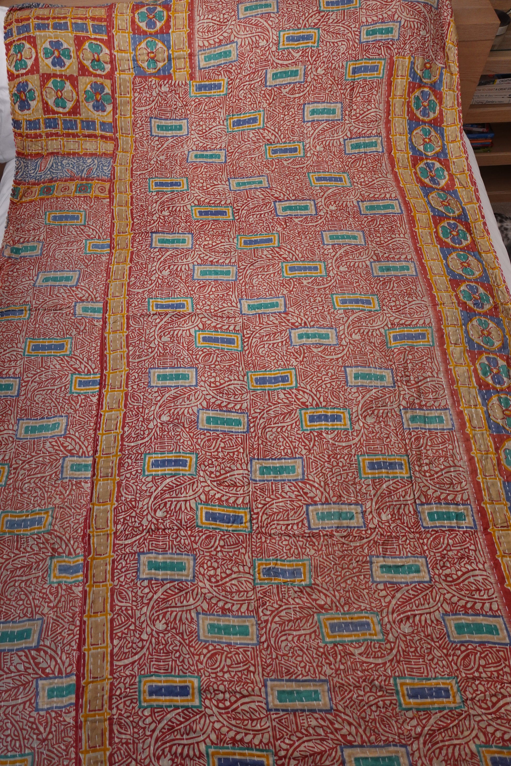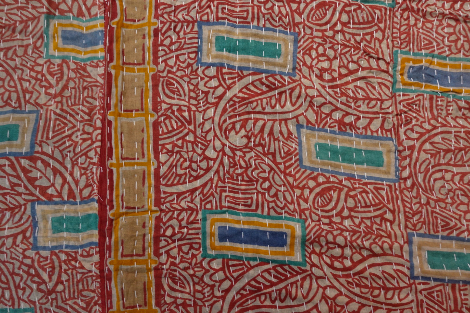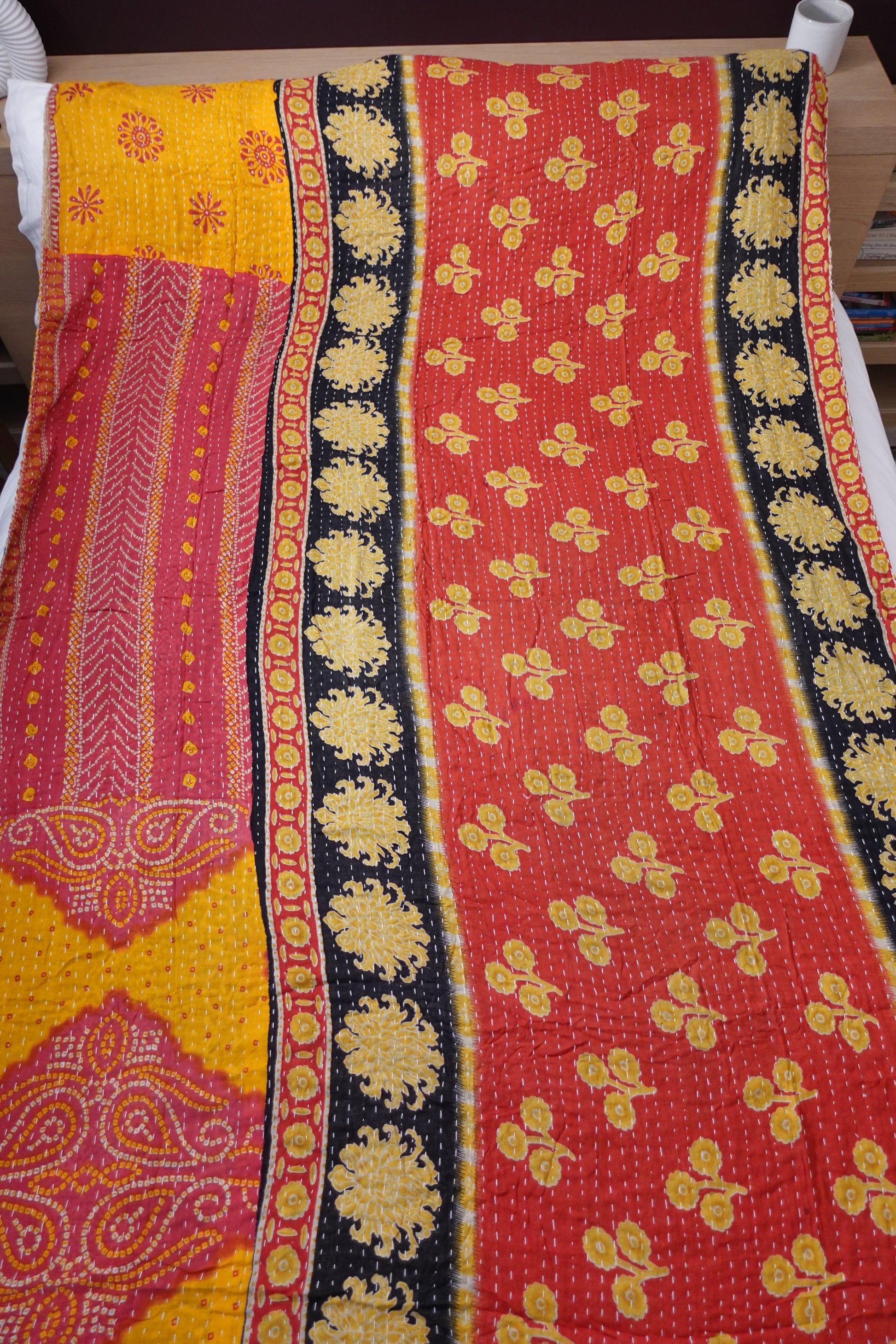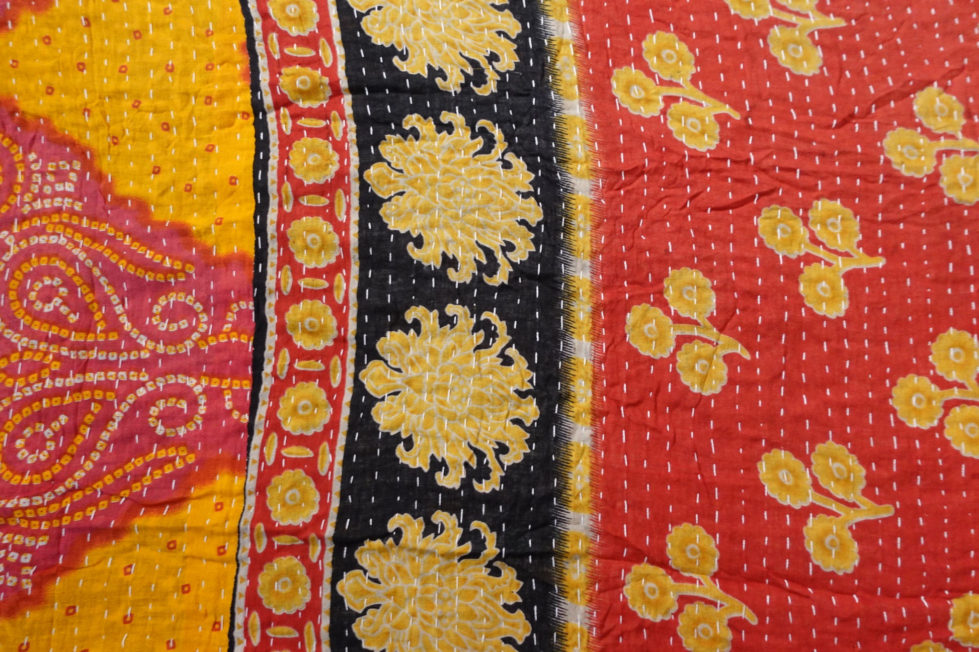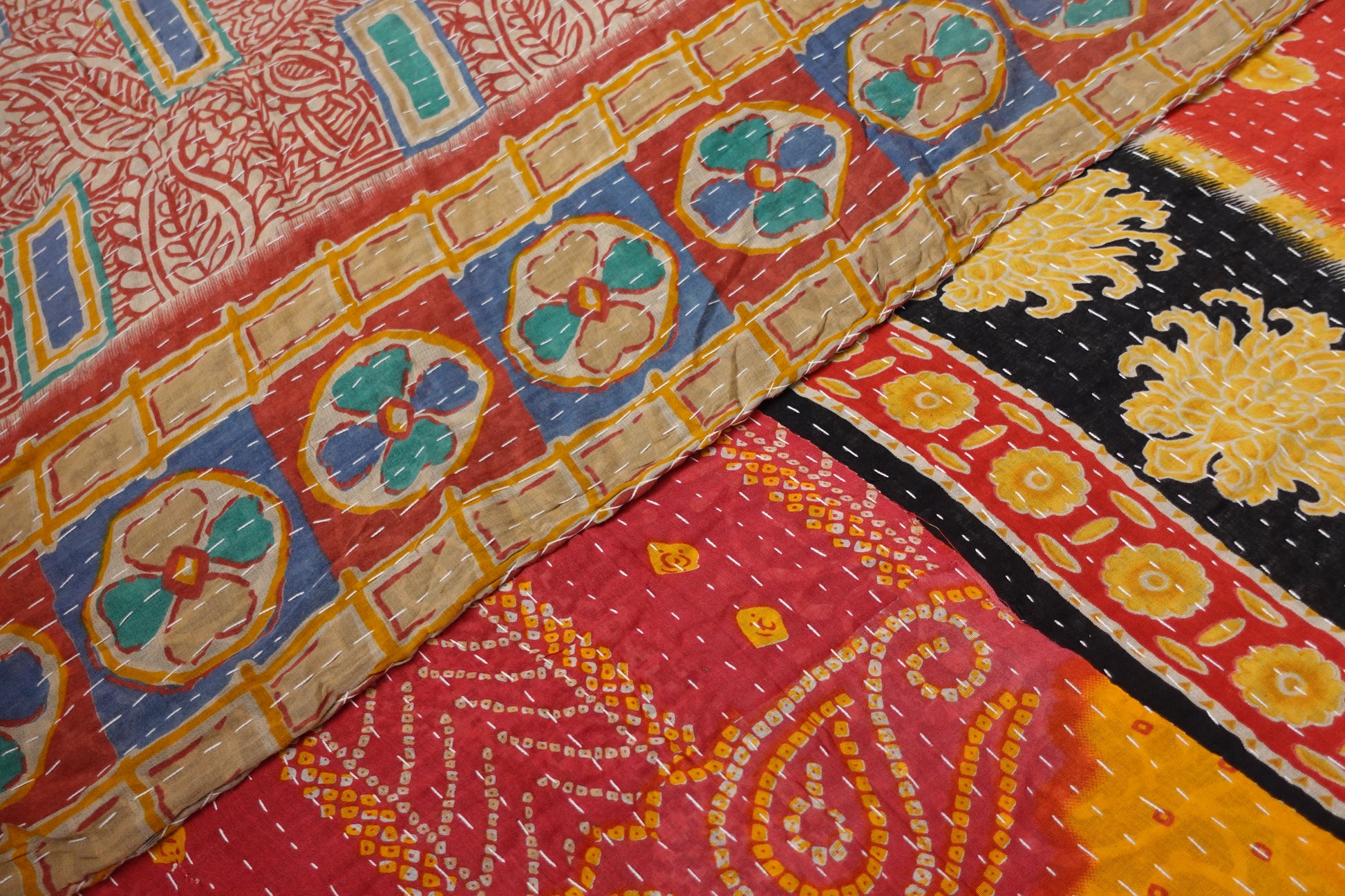 Beautiful, colourful Kantha throw made from recycled vintage saris sewn together with an all over running stitch.