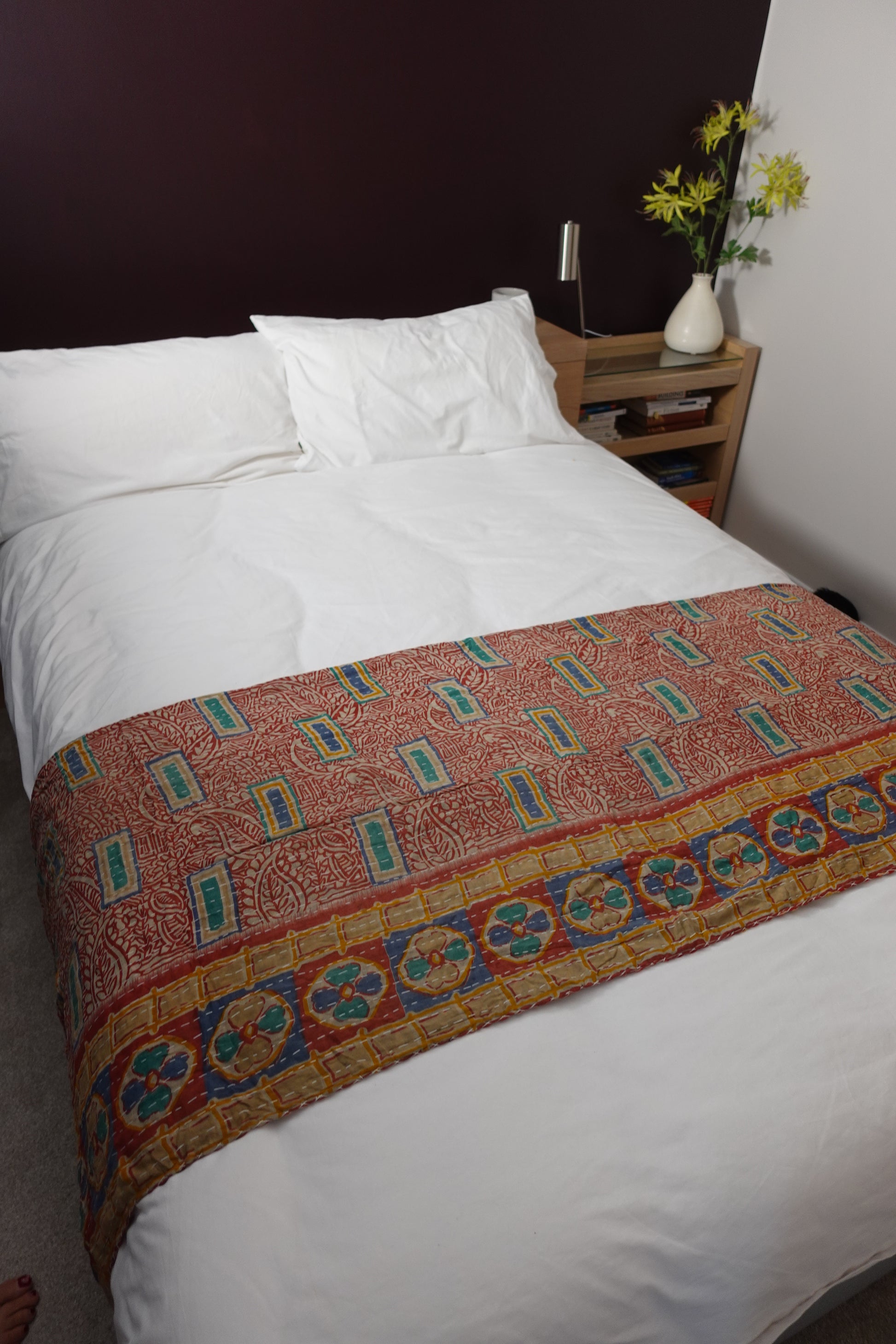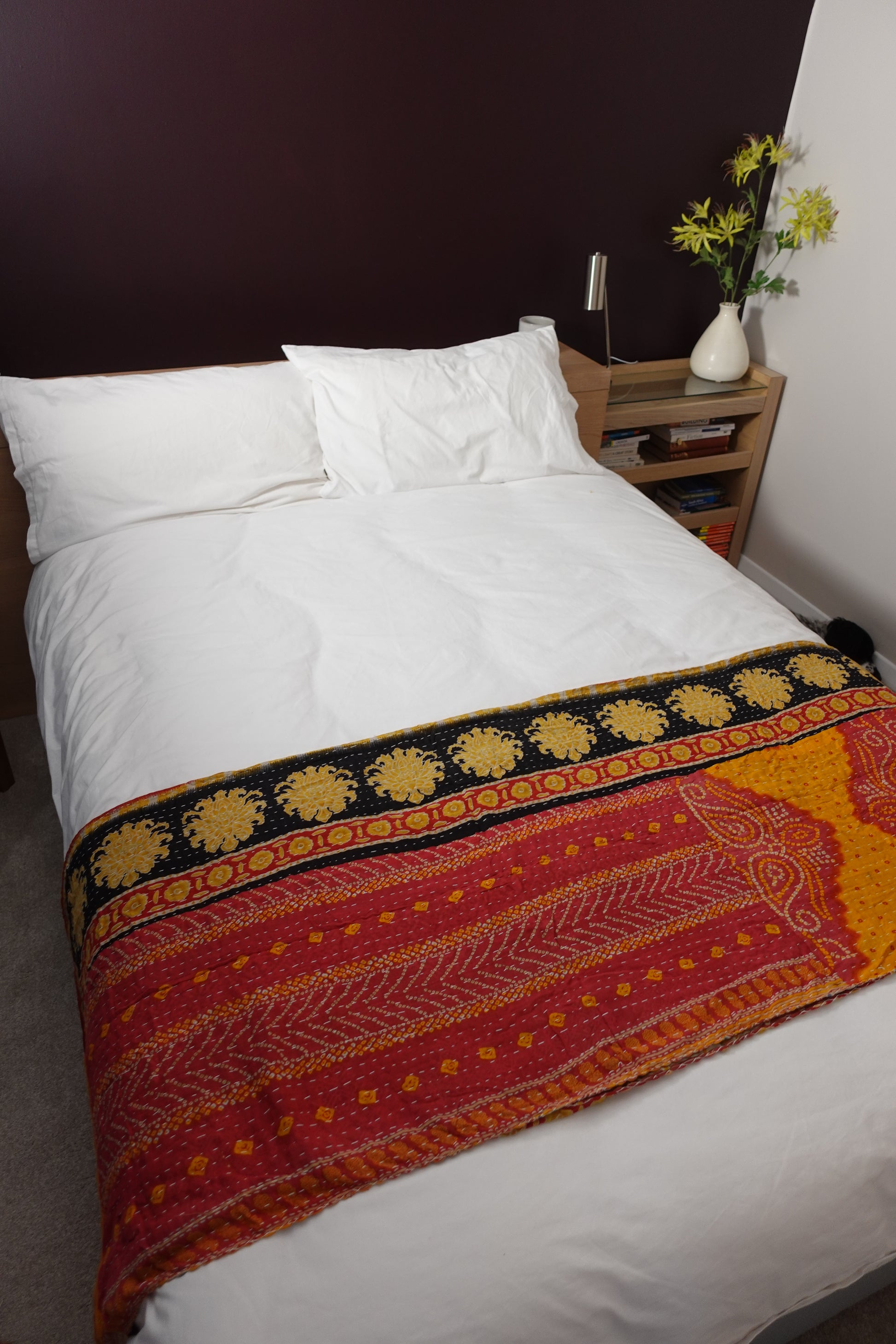 Layers of soft worn sari makes an attractive unique and cosy throw; great for any bed, sofa, campervan, etc.
