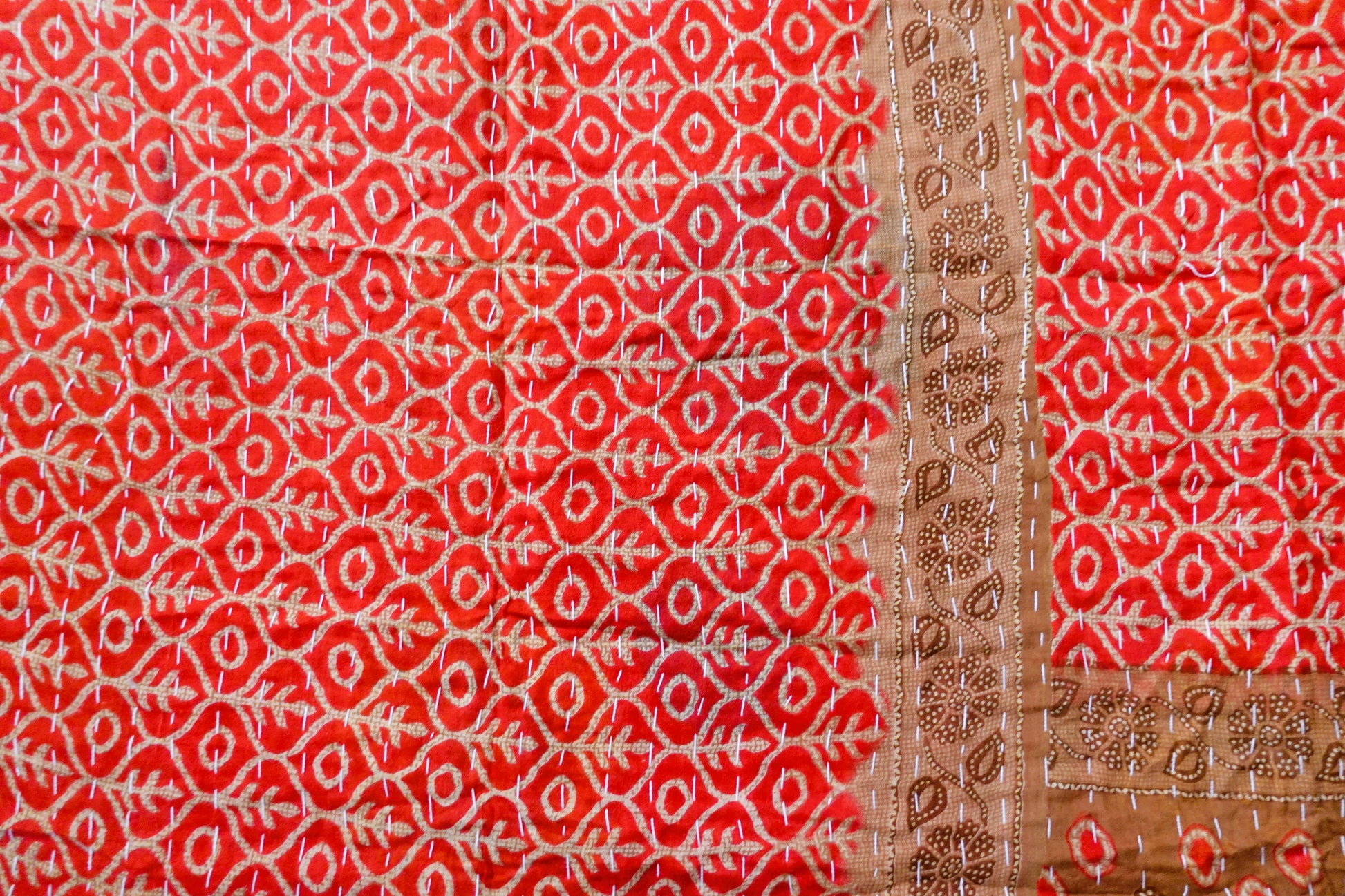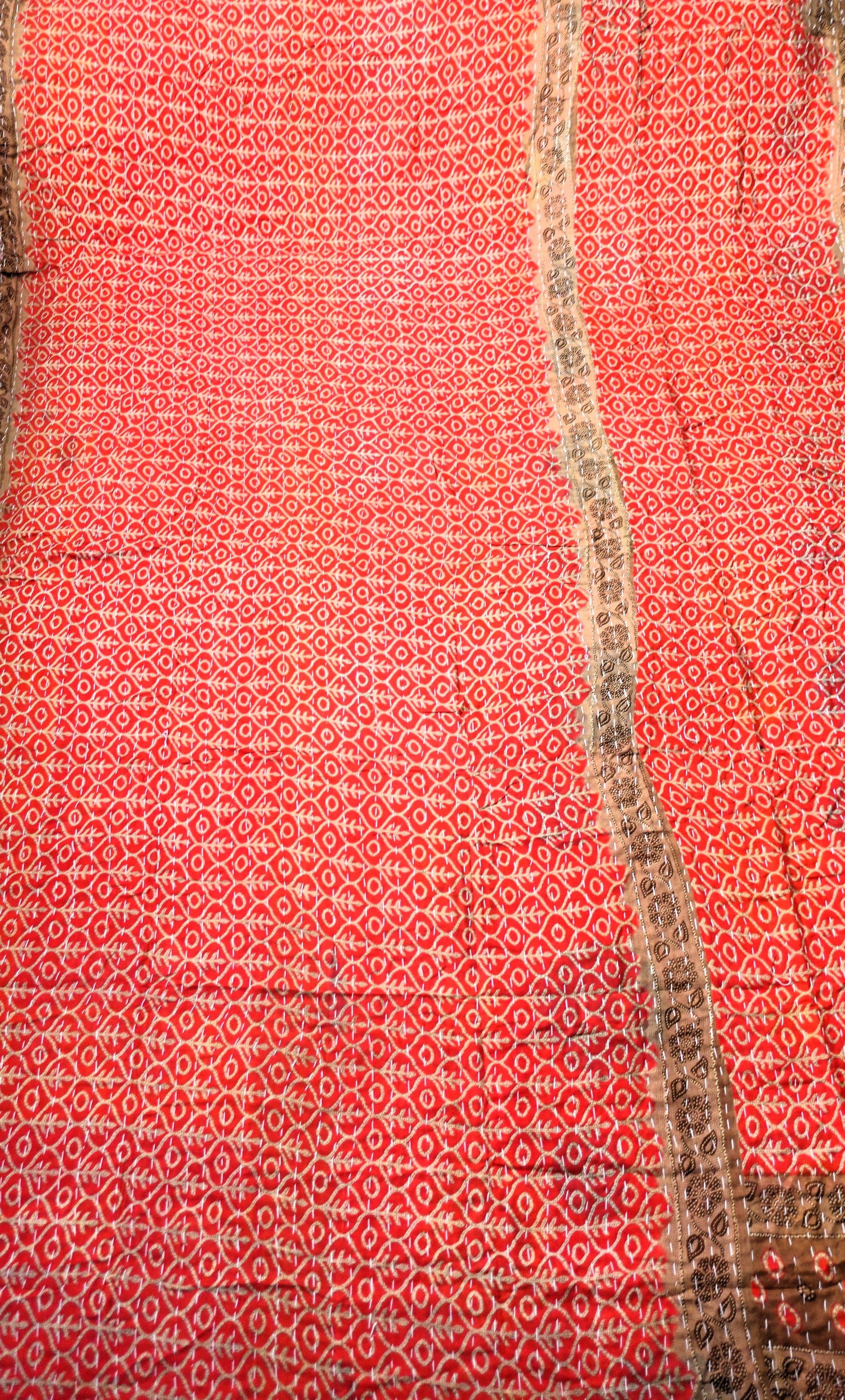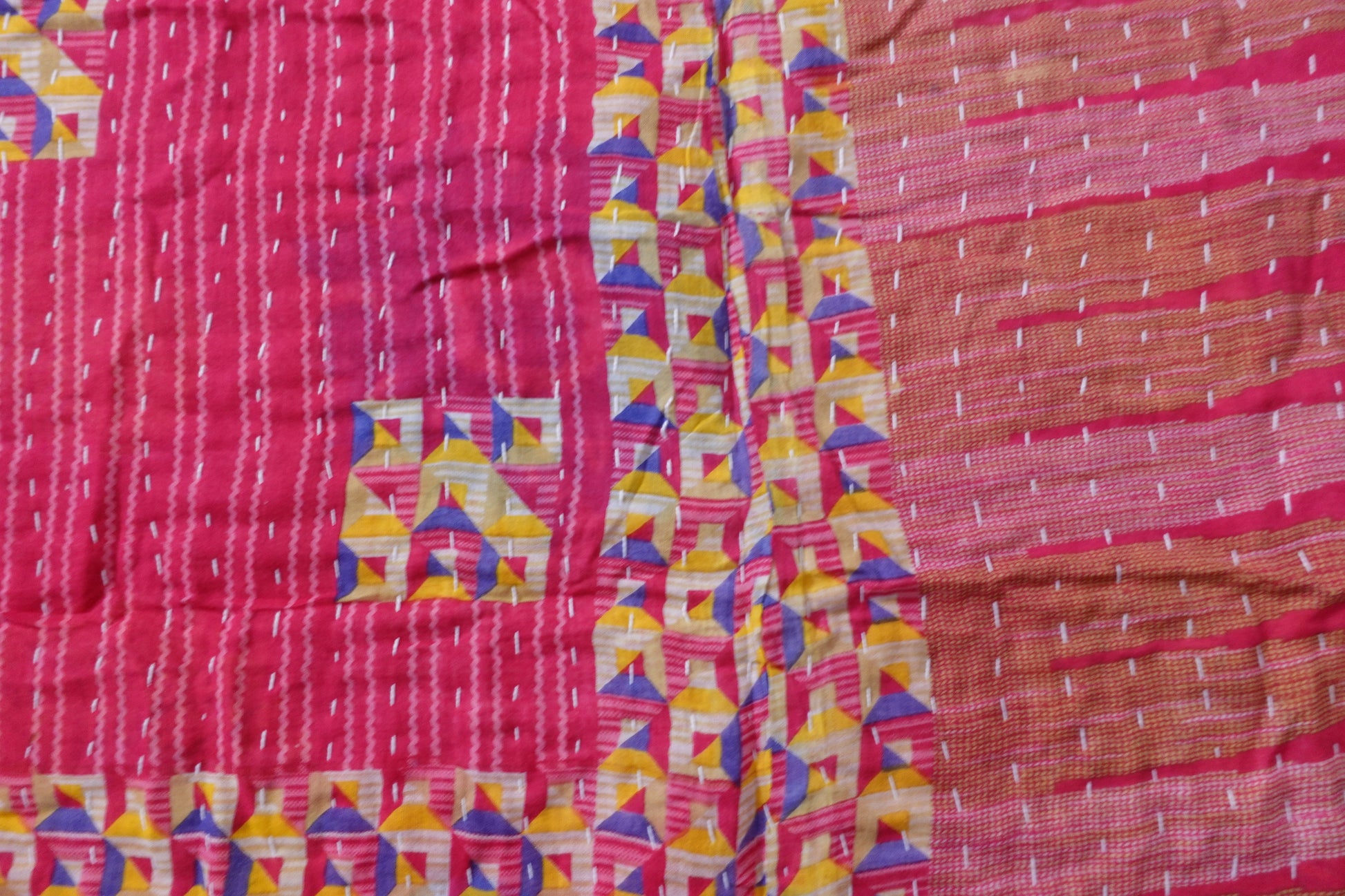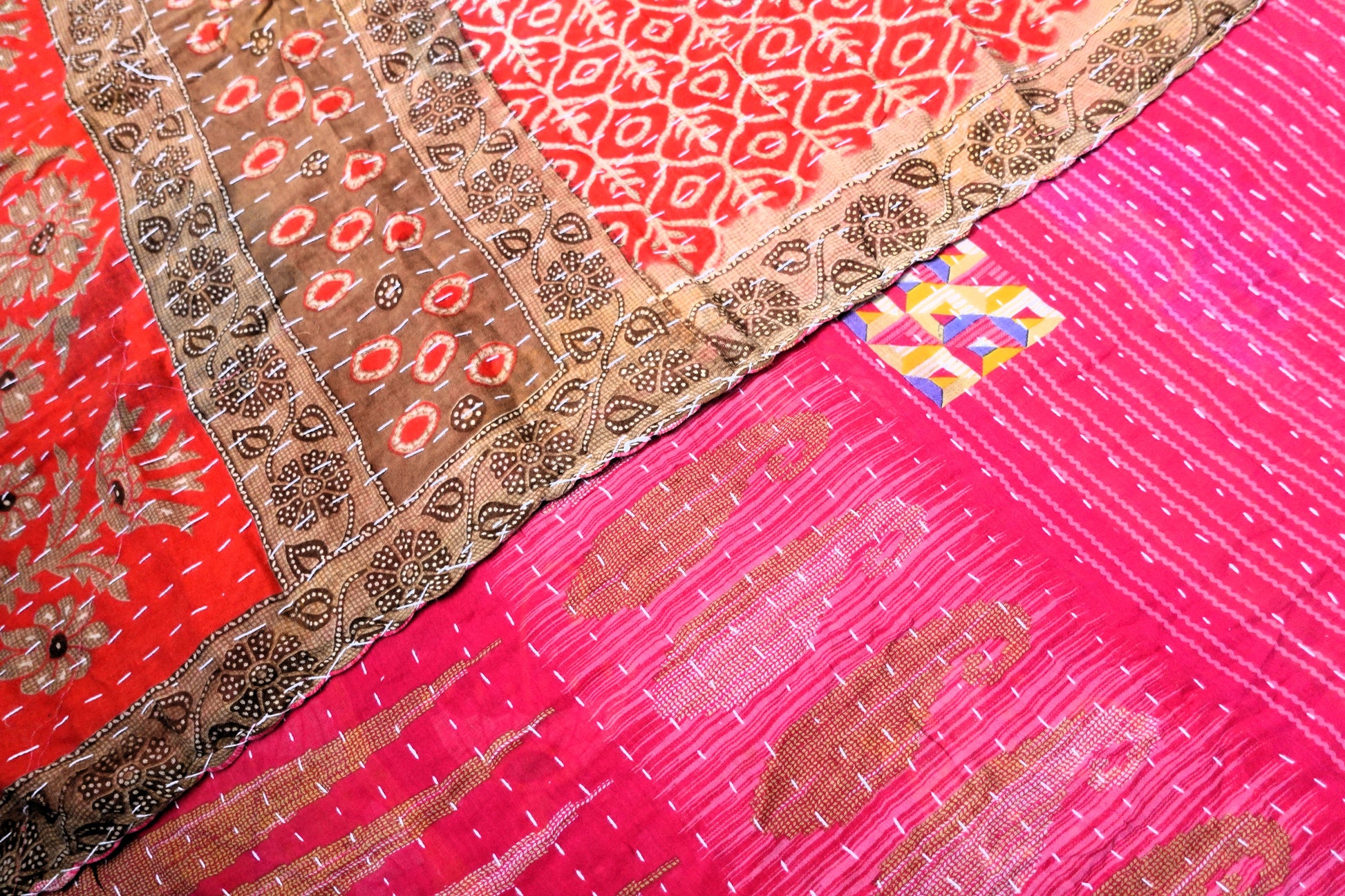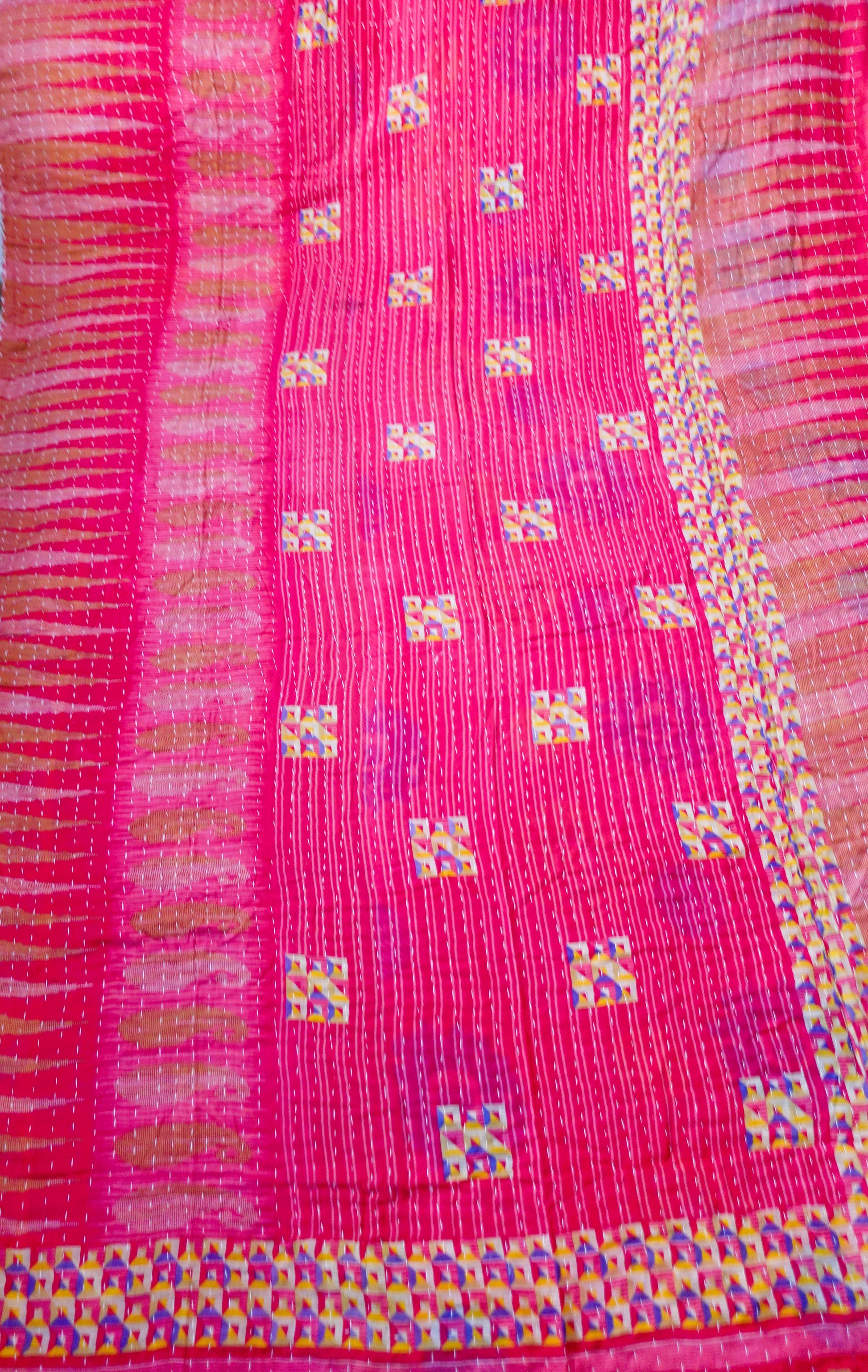 Beautiful, colourful Kantha throw made from recycled vintage saris sewn together with an all over running stitch.