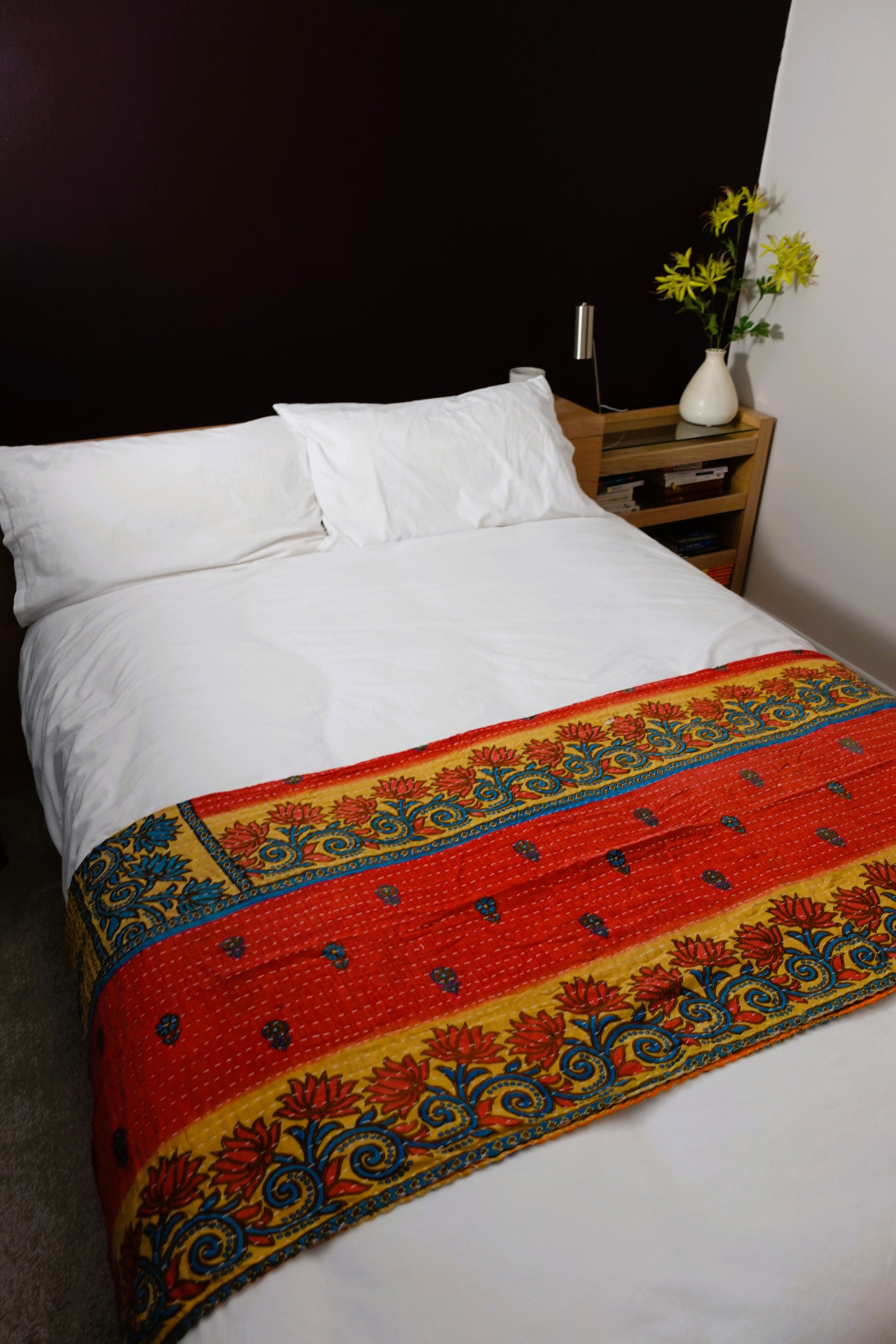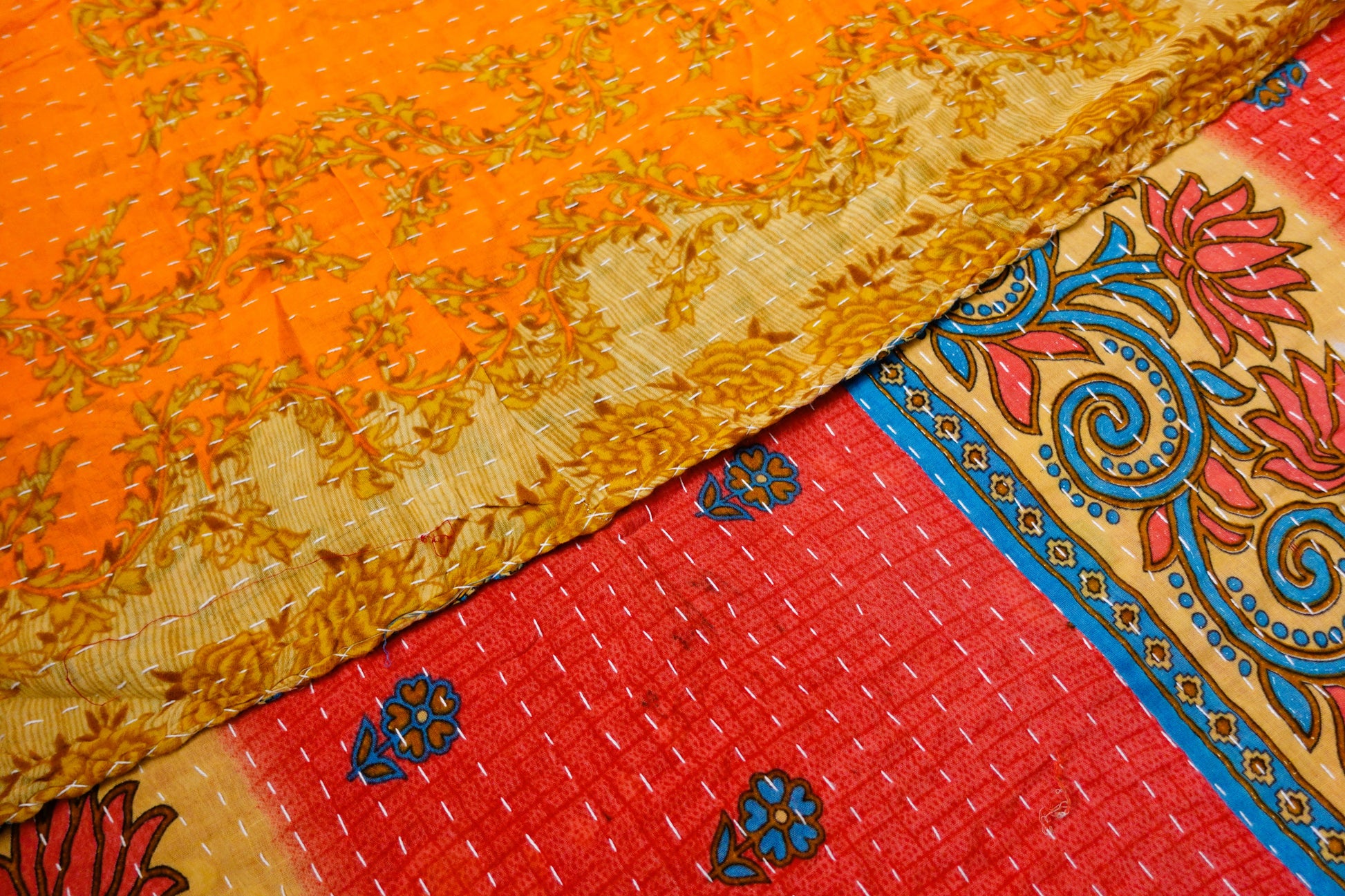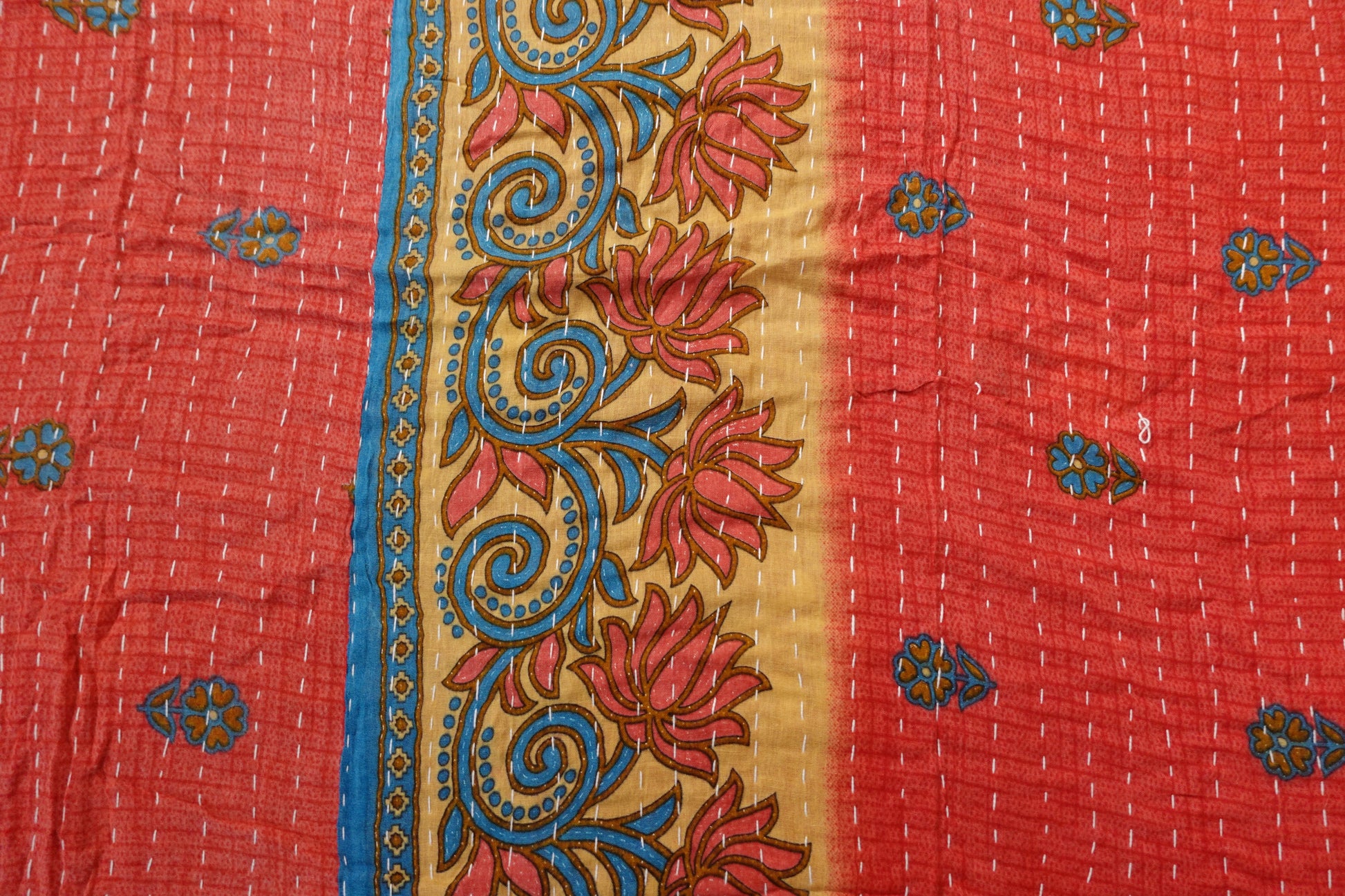 Beautiful, colourful Kantha throw made from recycled vintage saris sewn together with an all over running stitch.