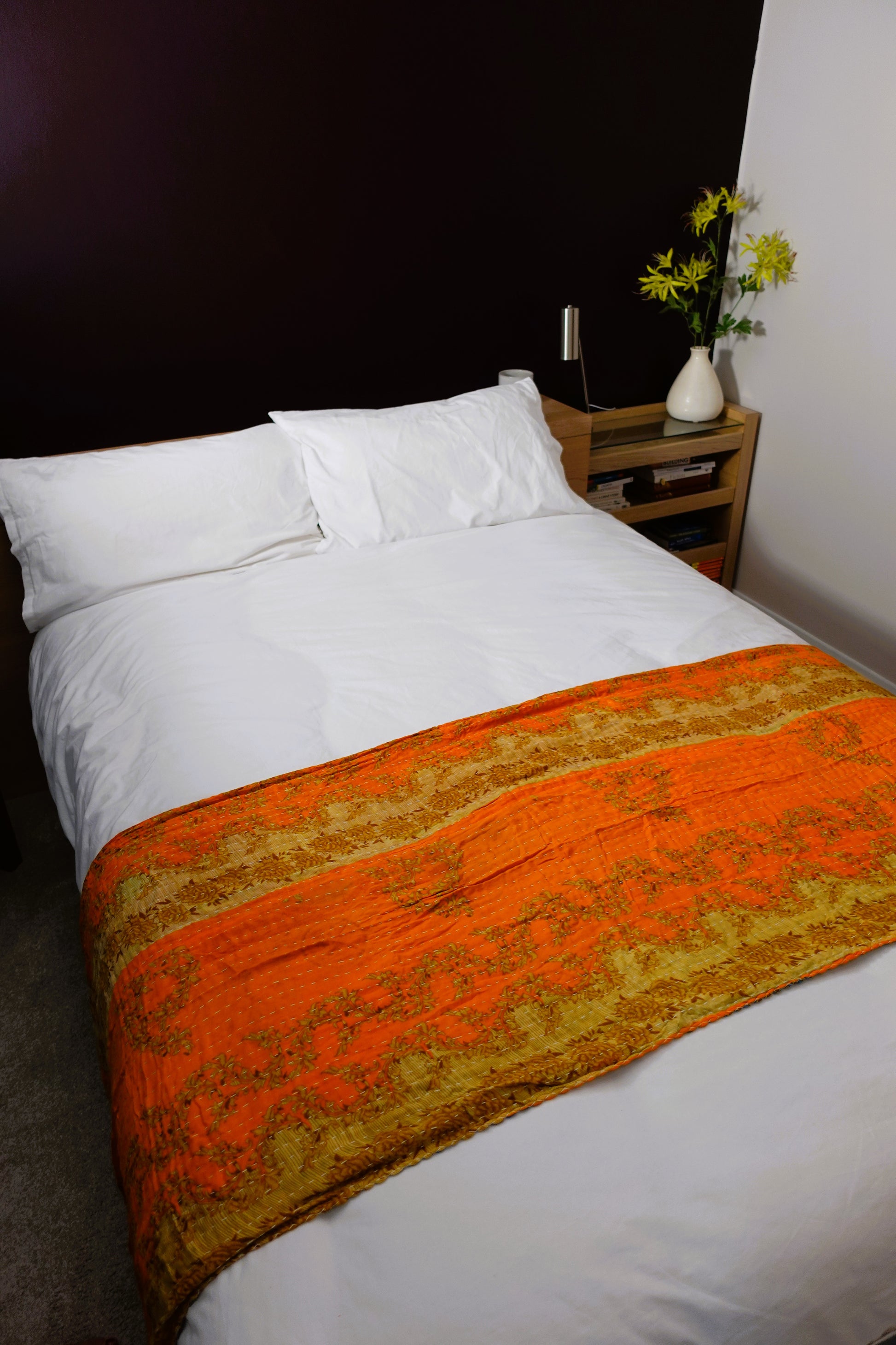 Layers of soft worn sari makes an attractive unique and cosy throw; great for any bed, sofa, campervan, etc.