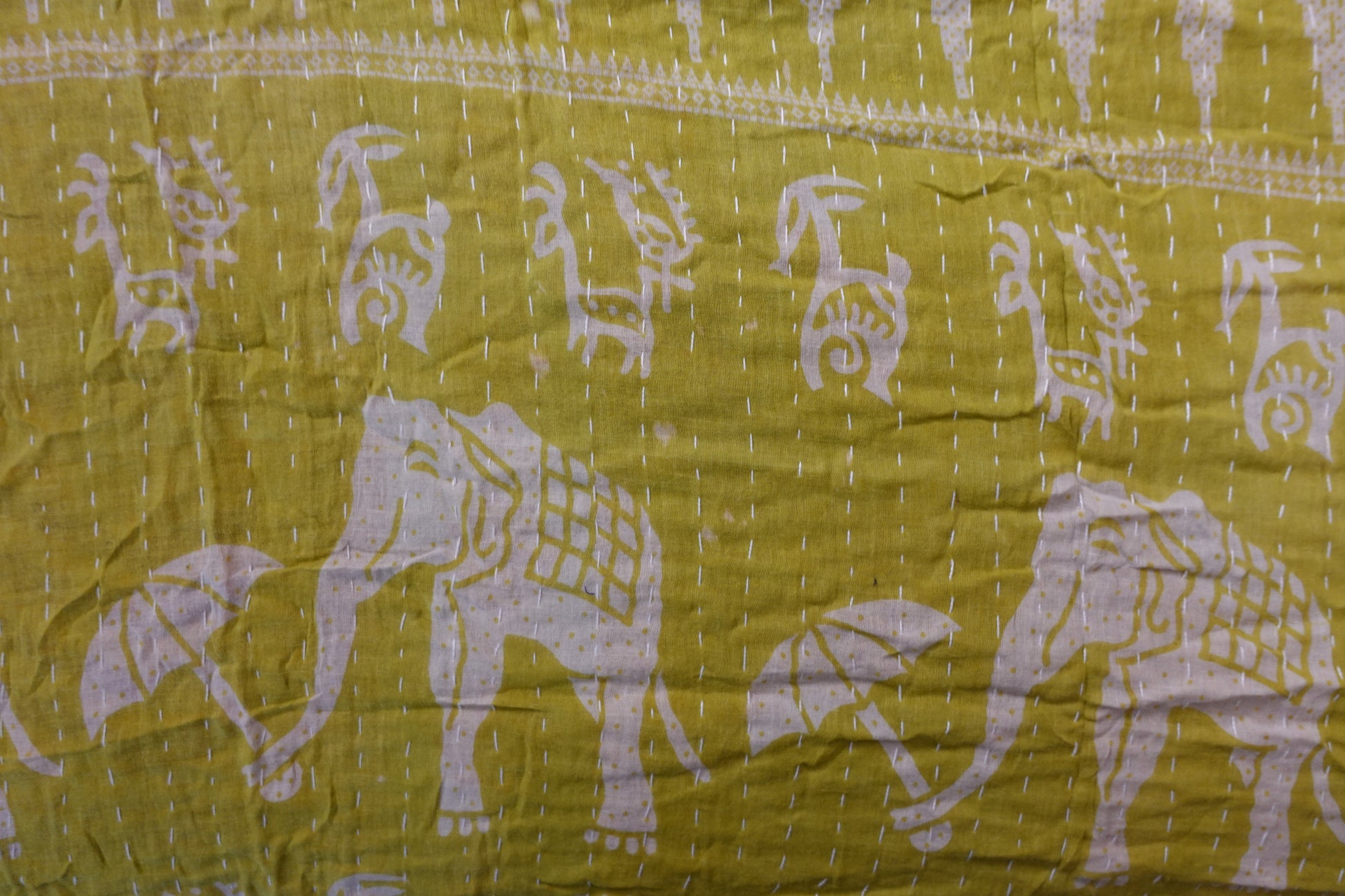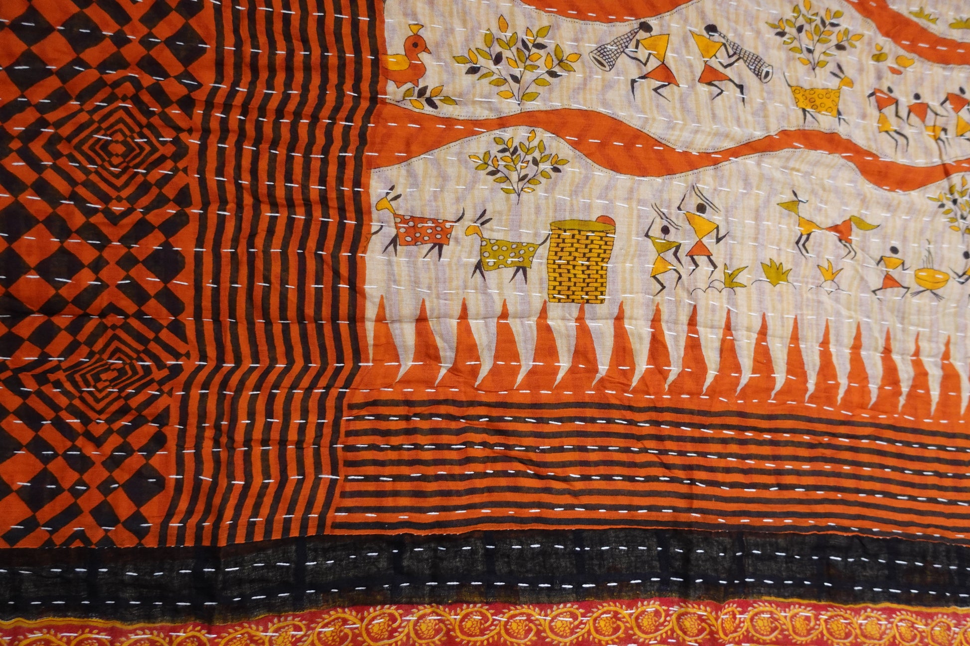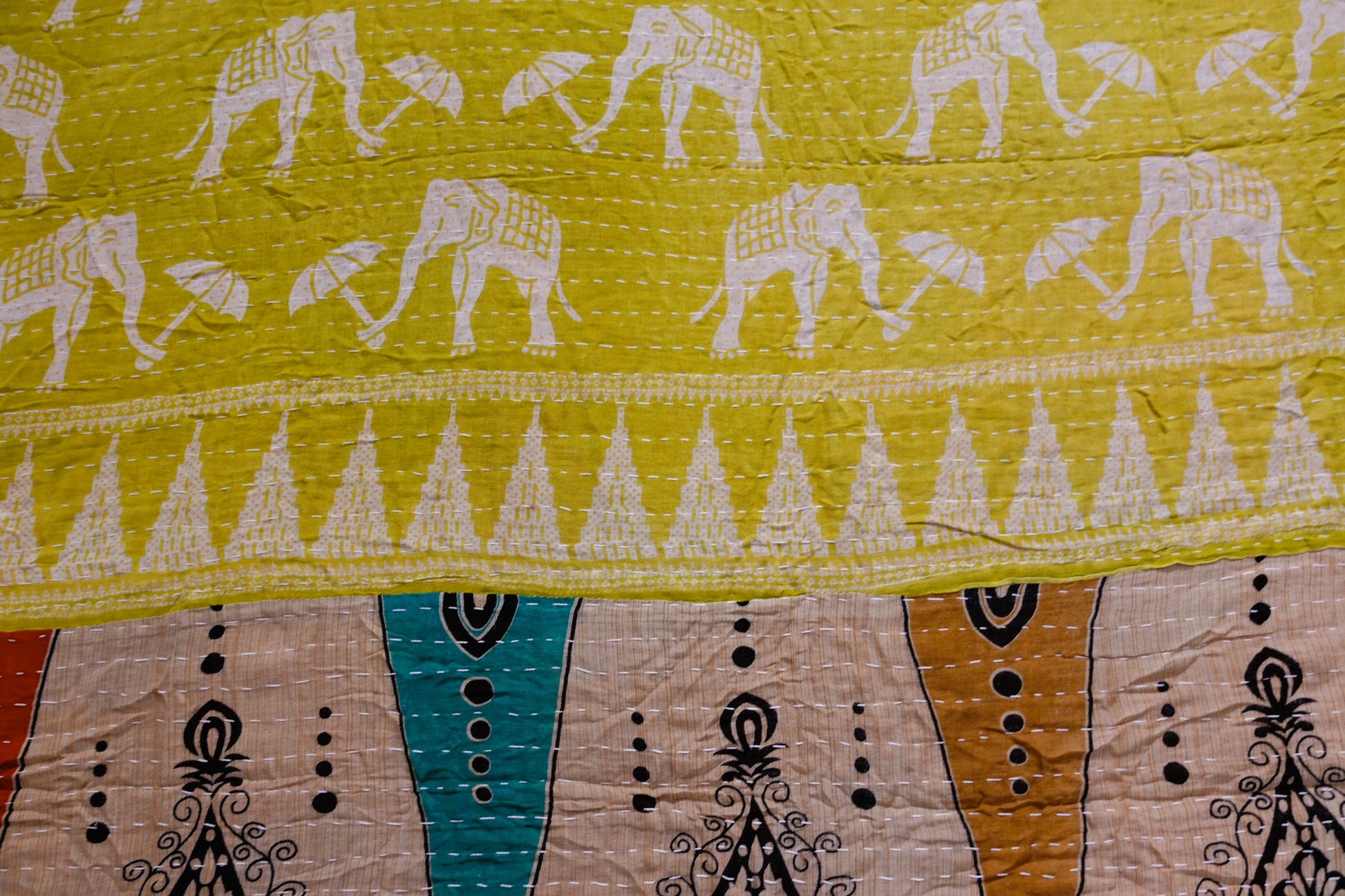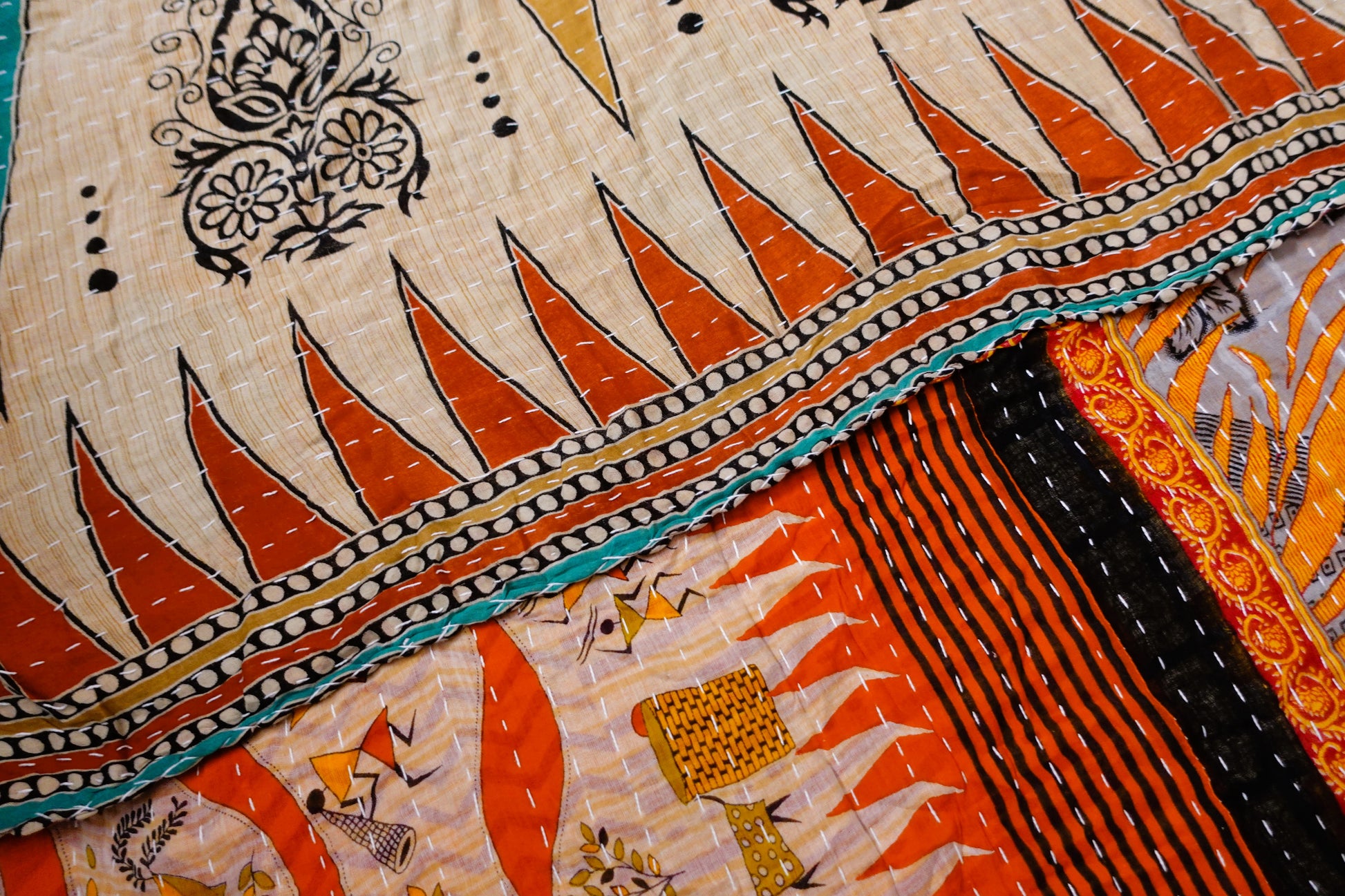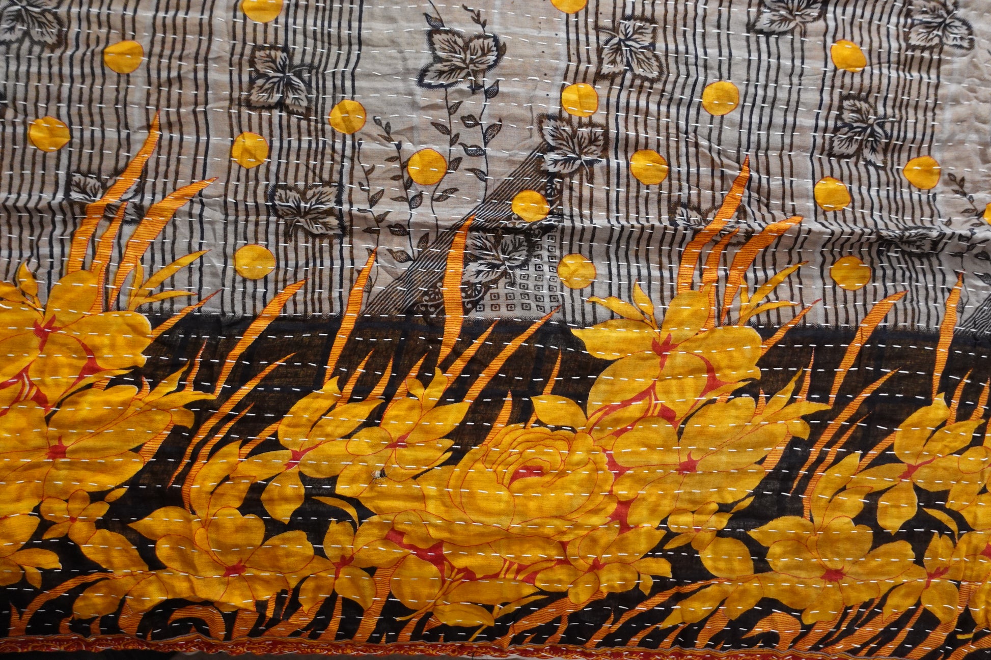 Beautiful, colourful Kantha throw made from recycled vintage saris sewn together with an all over running stitch.