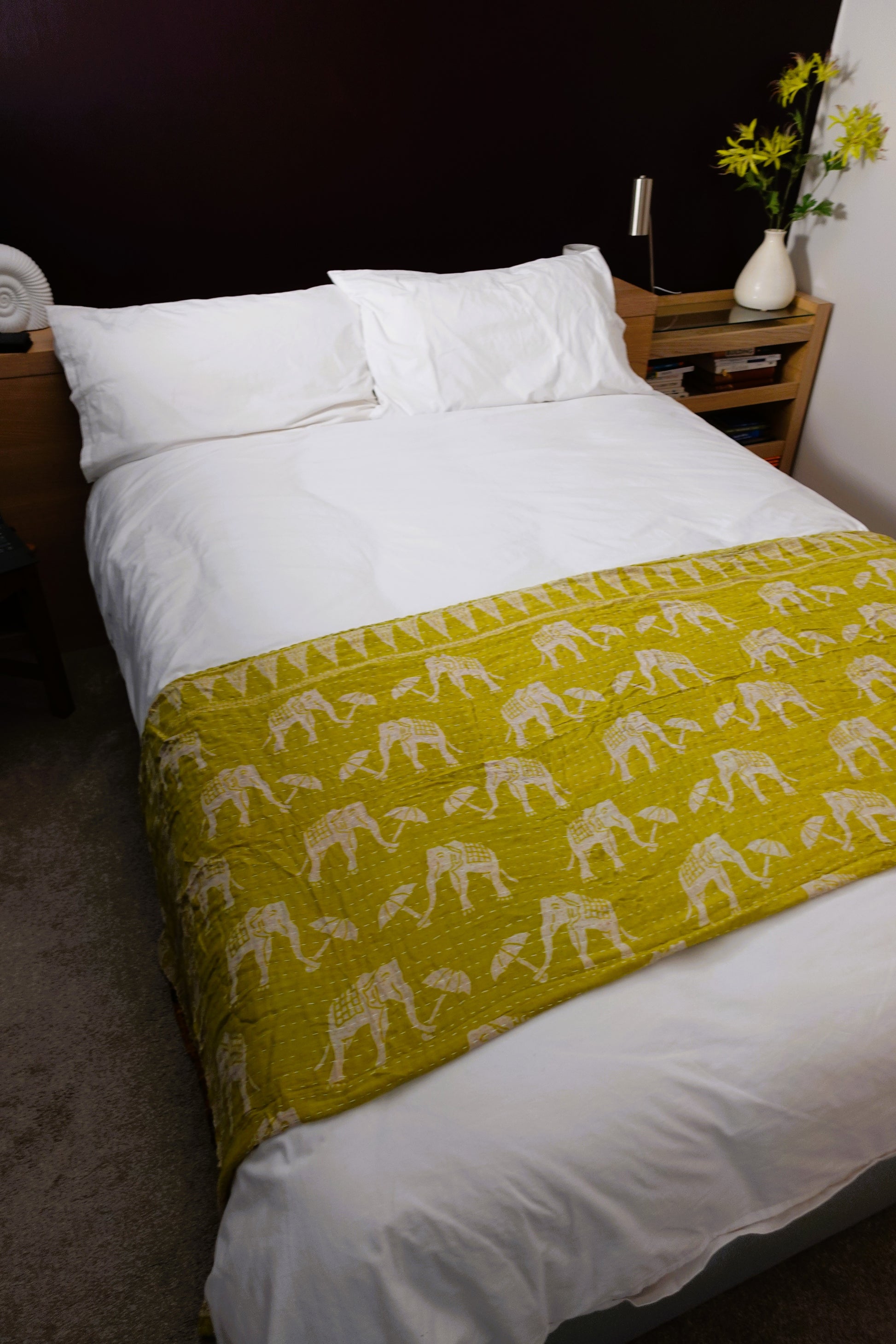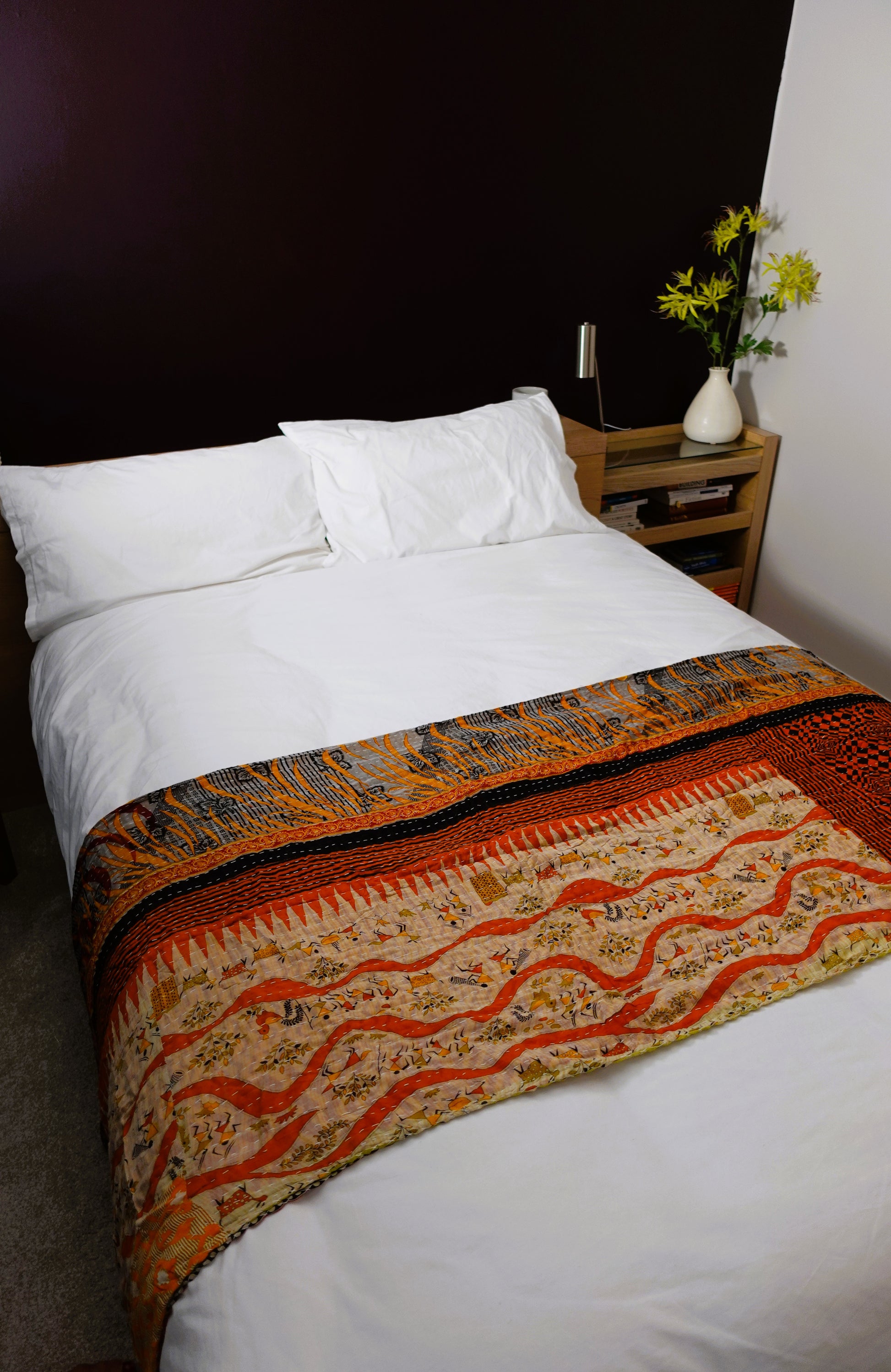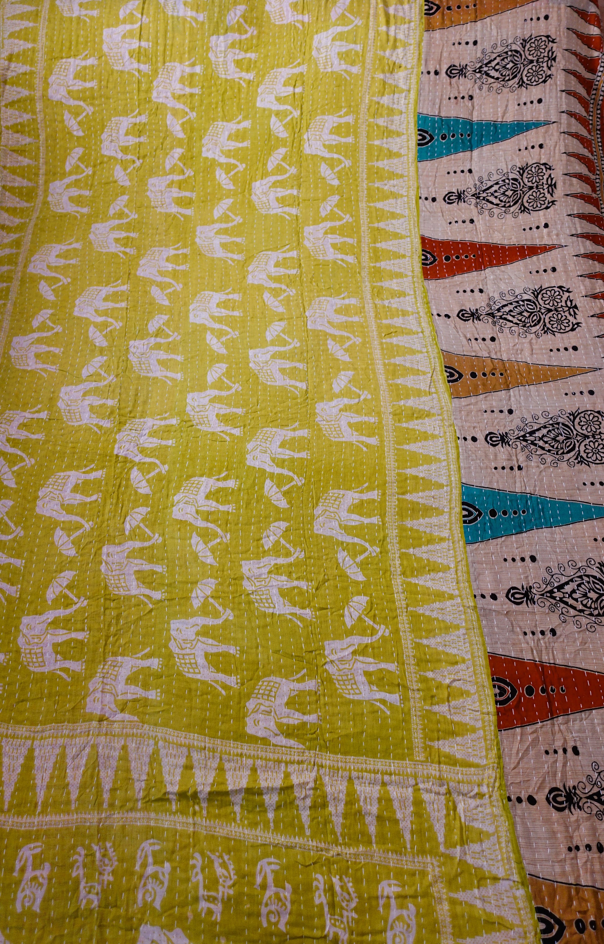 Layers of soft worn sari makes an attractive unique and cosy throw; great for any bed, sofa, campervan, etc.