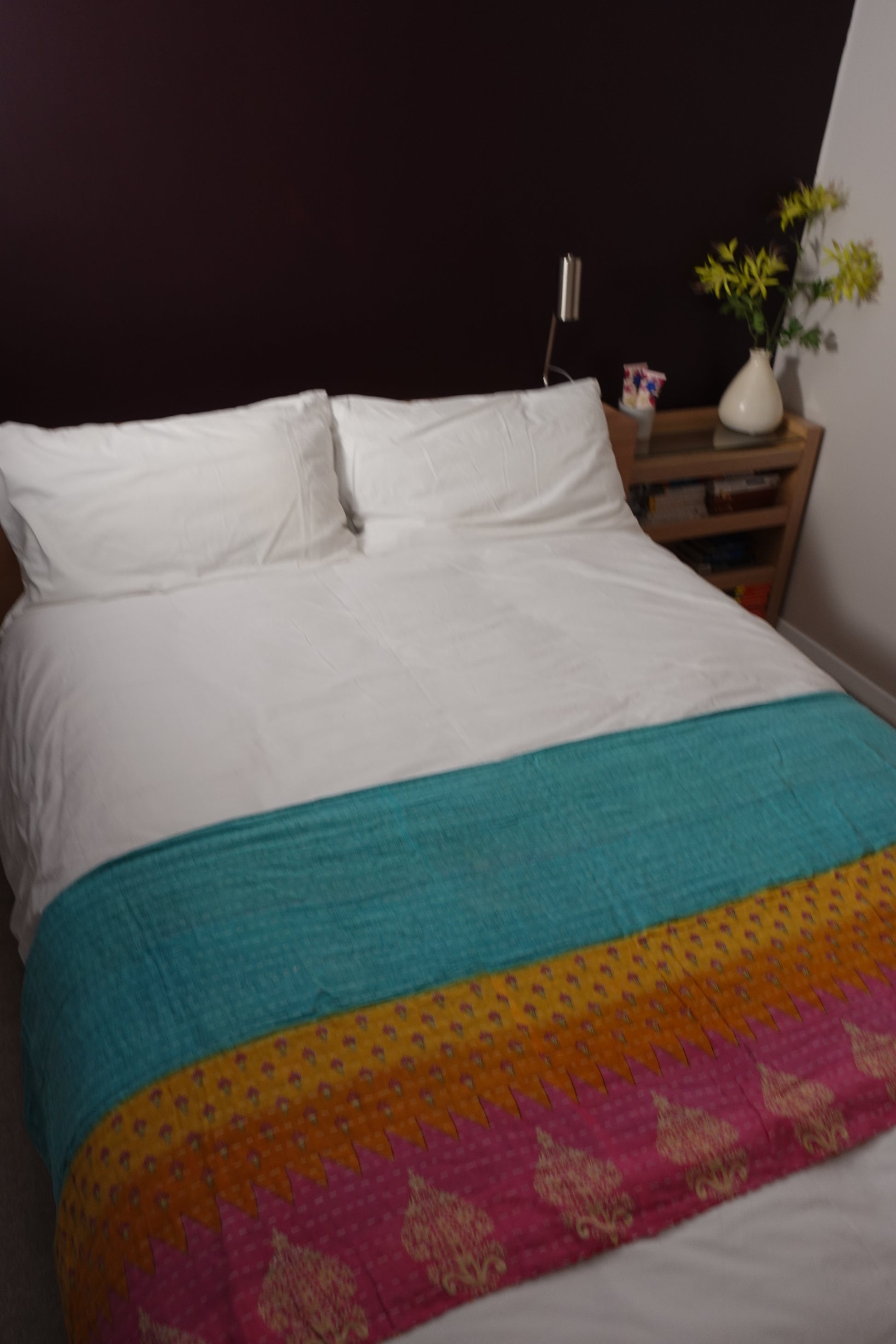 Layers of soft worn sari makes an attractive unique and cosy throw; great for any bed, sofa, campervan, etc.