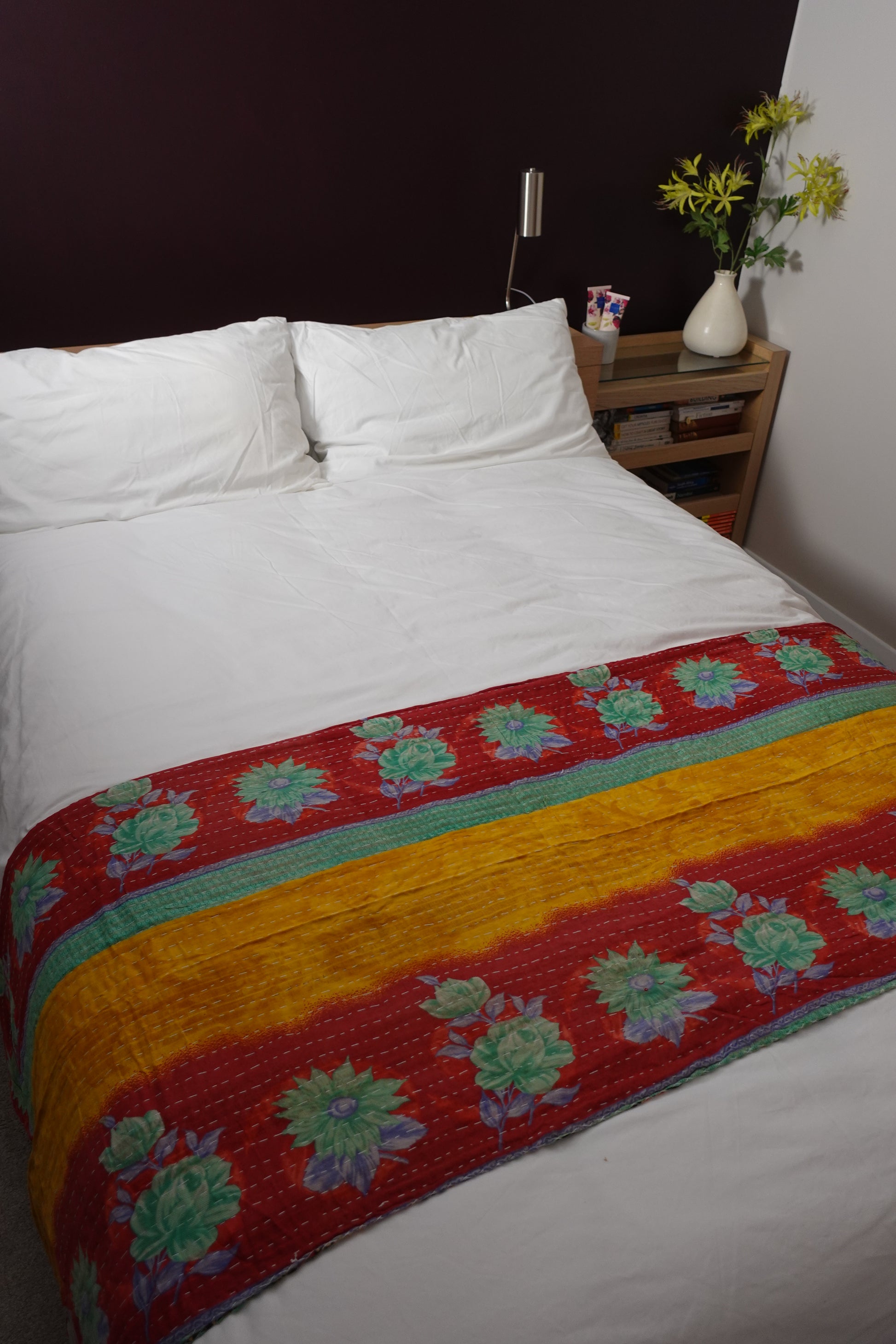 Layers of soft worn sari makes an attractive unique and cosy throw; great for any bed, sofa, campervan, etc.