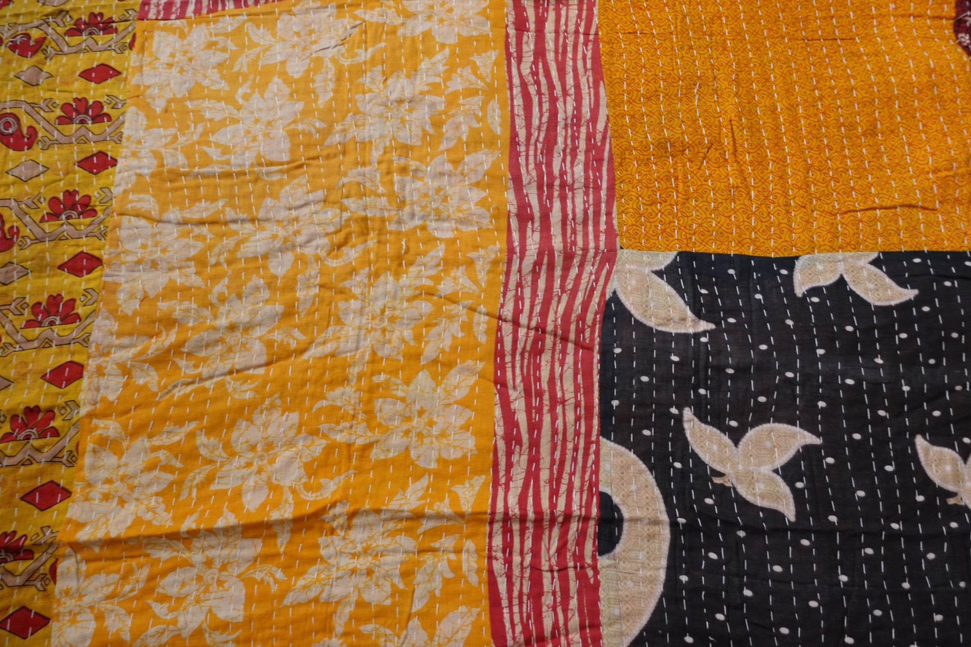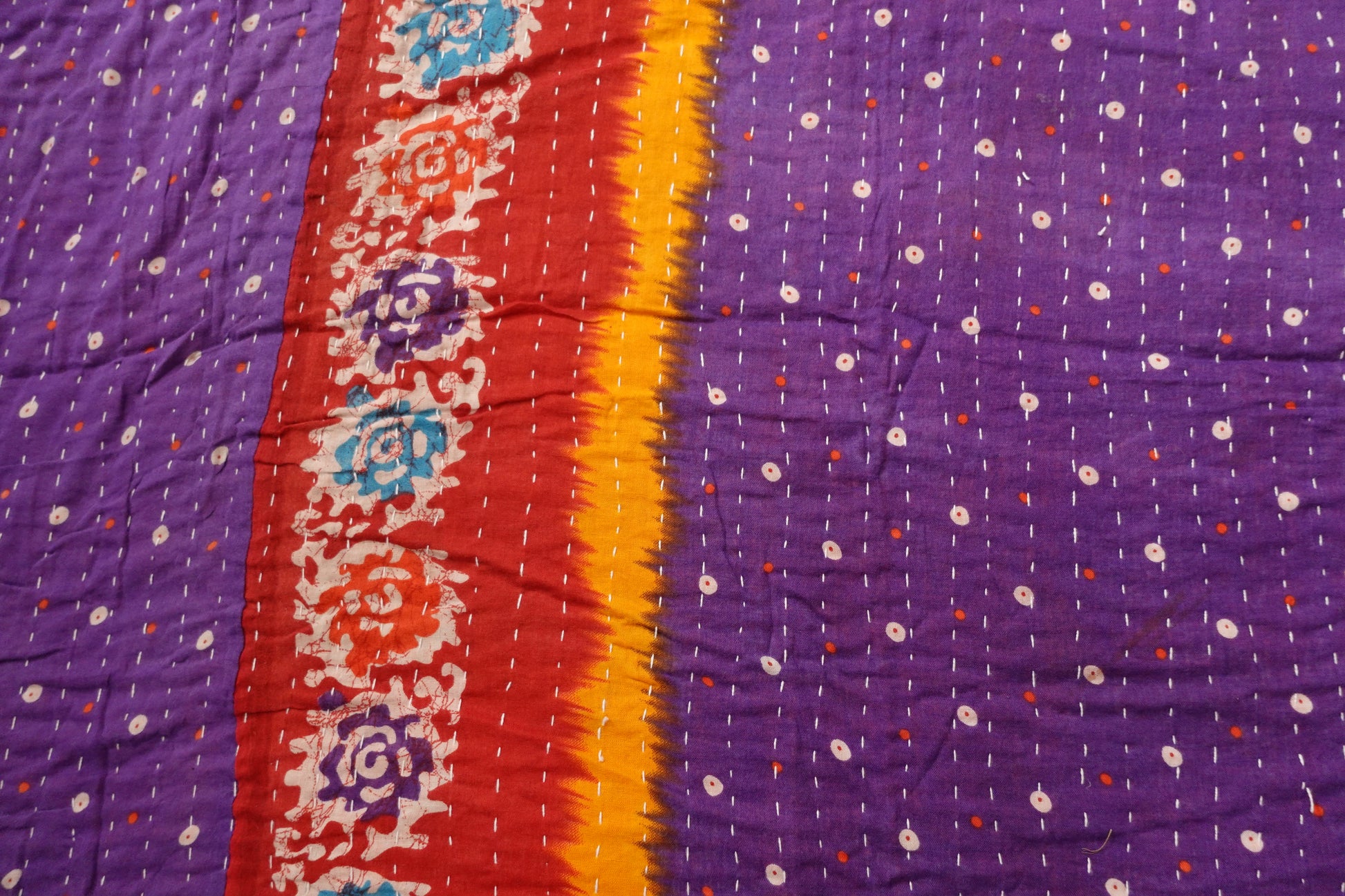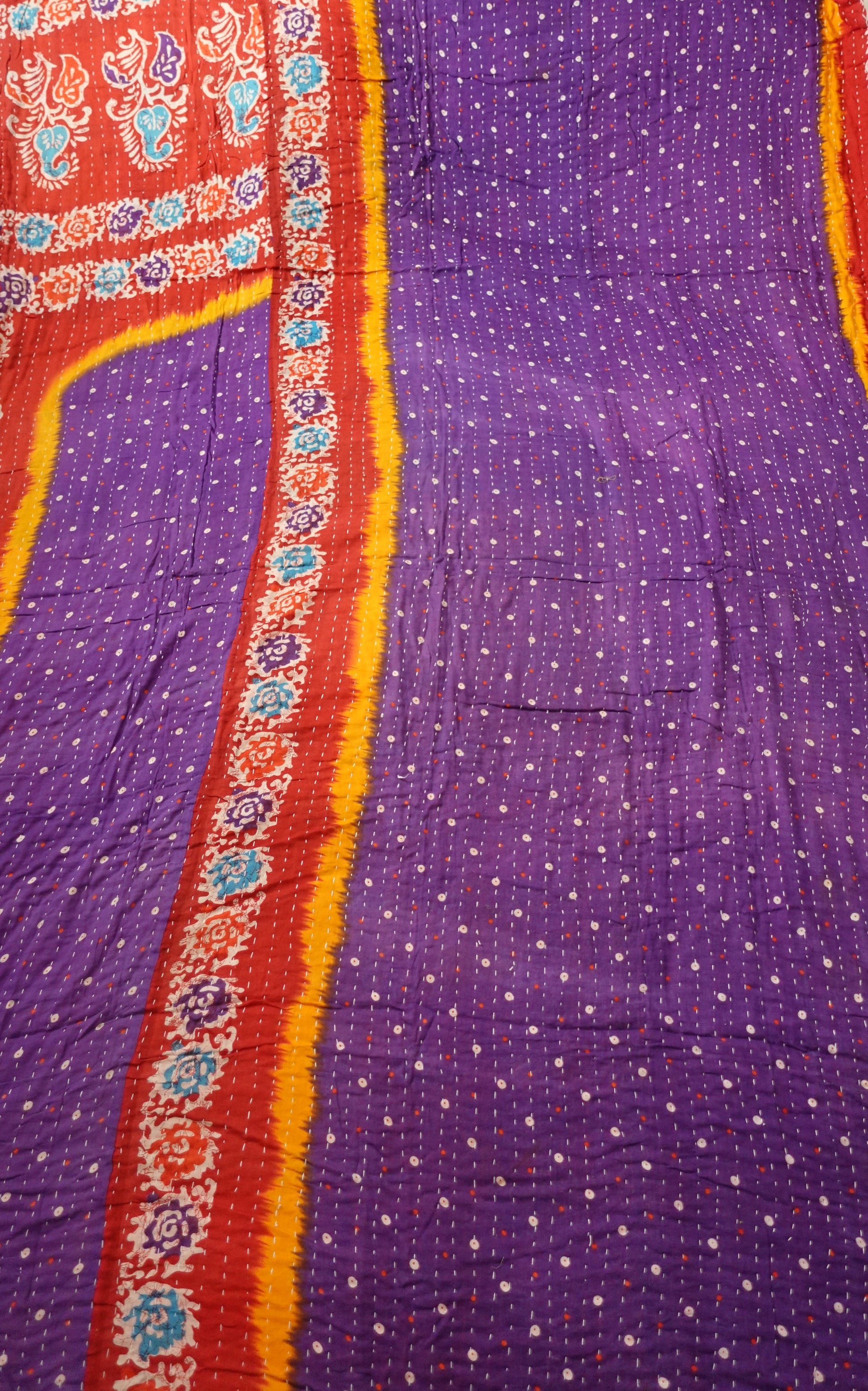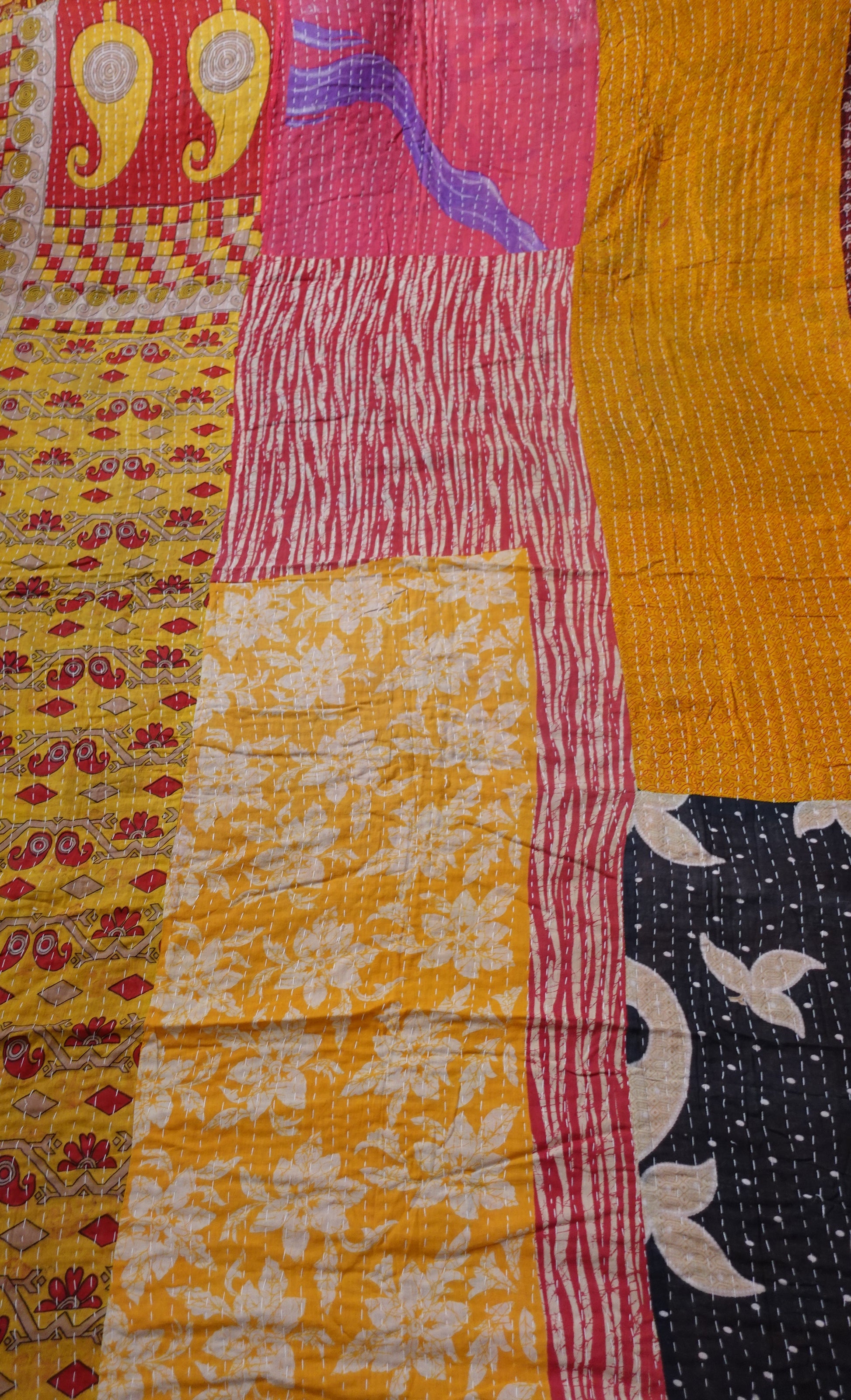 Beautiful, colourful Kantha throw made from recycled vintage saris sewn together with an all over running stitch.