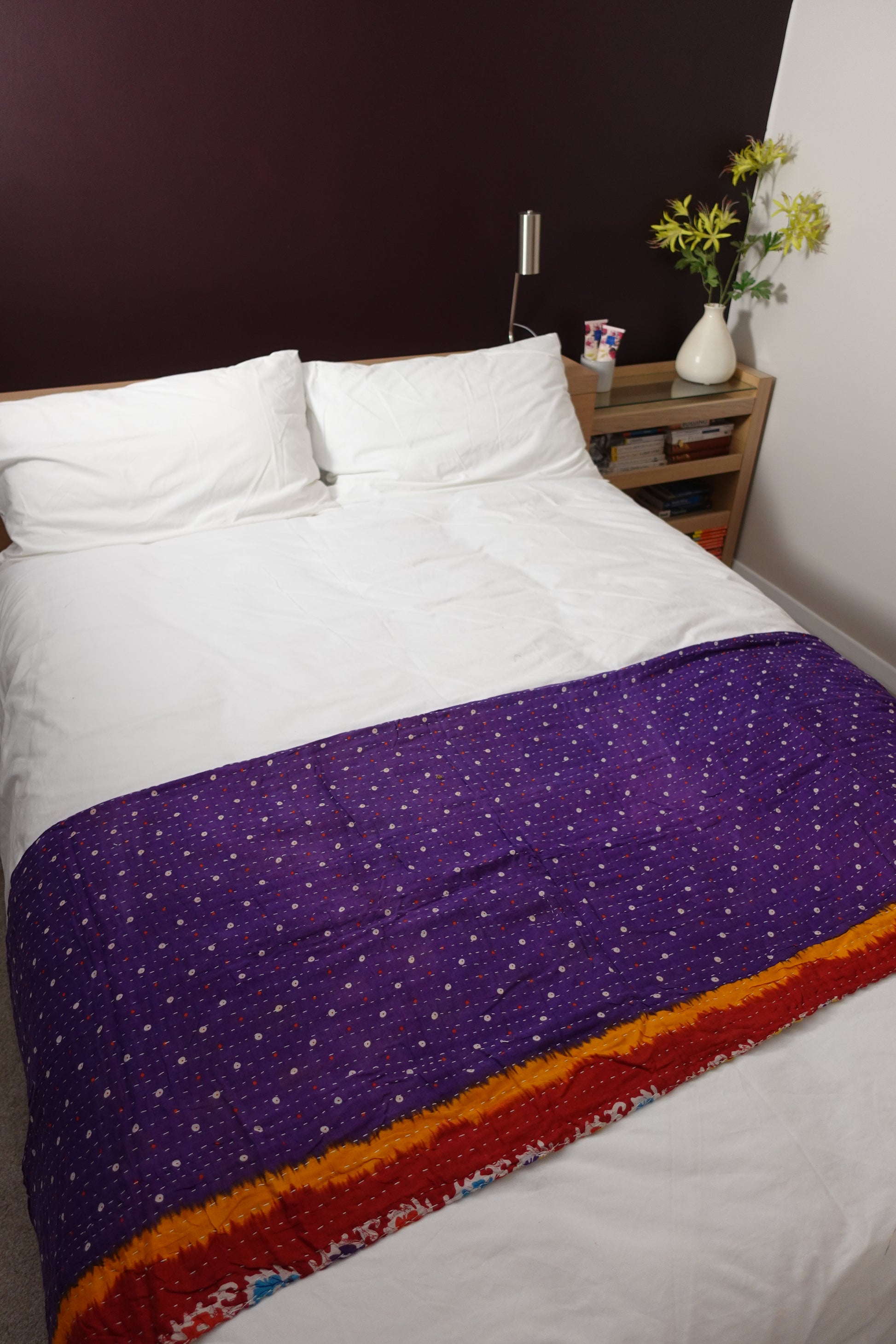 Layers of soft worn sari makes an attractive unique and cosy throw; great for any bed, sofa, campervan, etc.