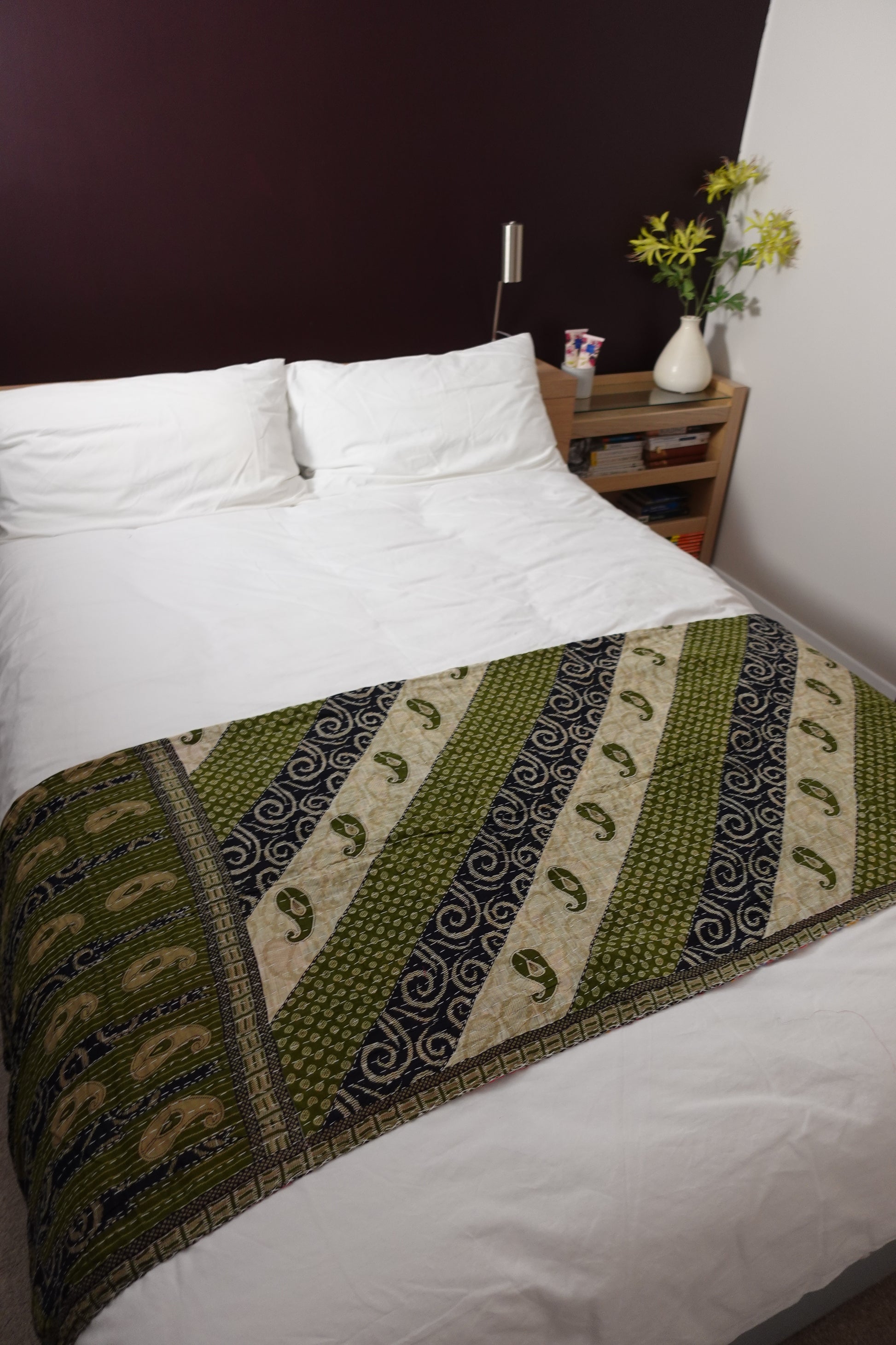 Layers of soft worn sari makes an attractive unique and cosy throw; great for any bed, sofa, campervan, etc.
