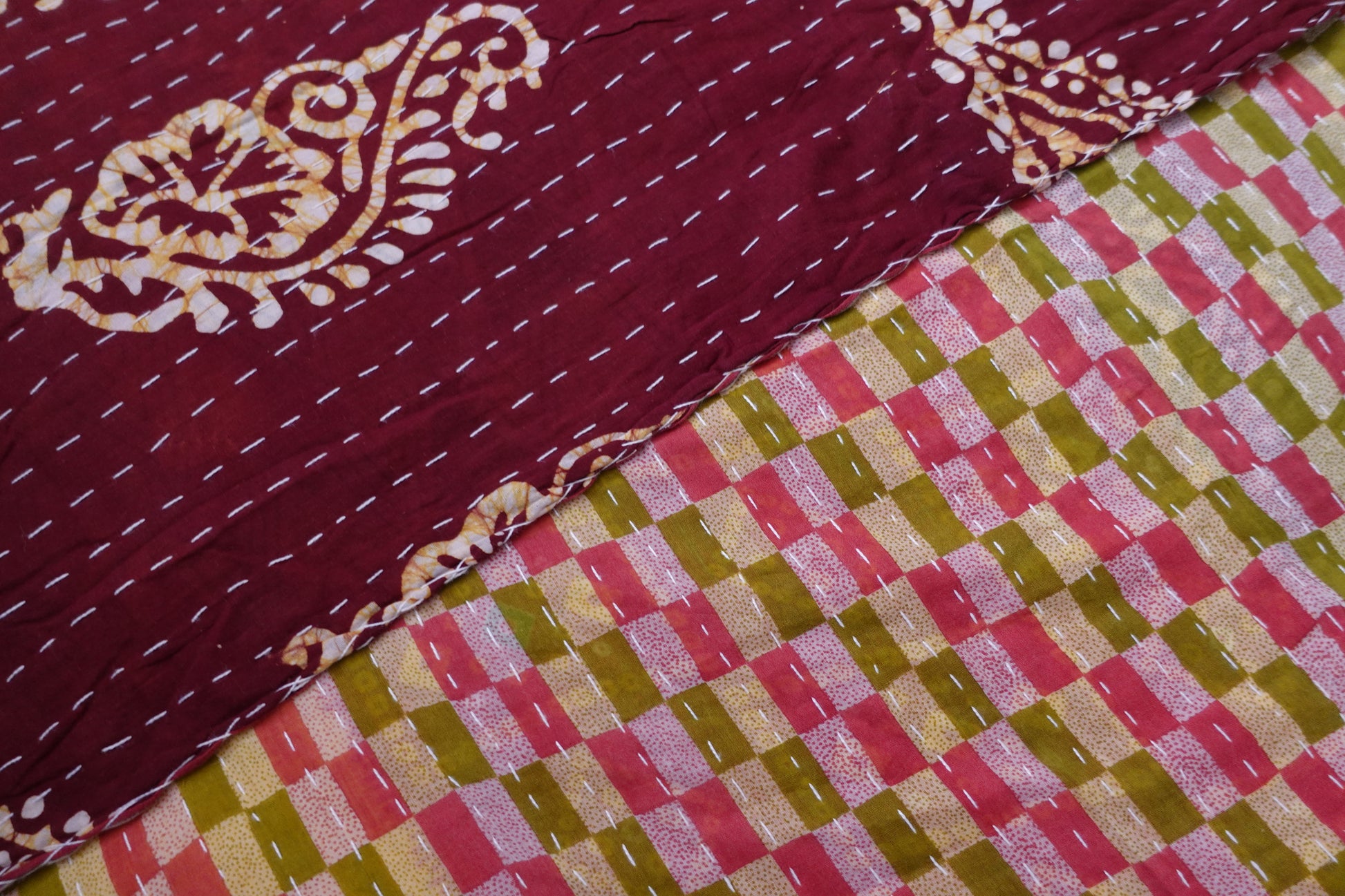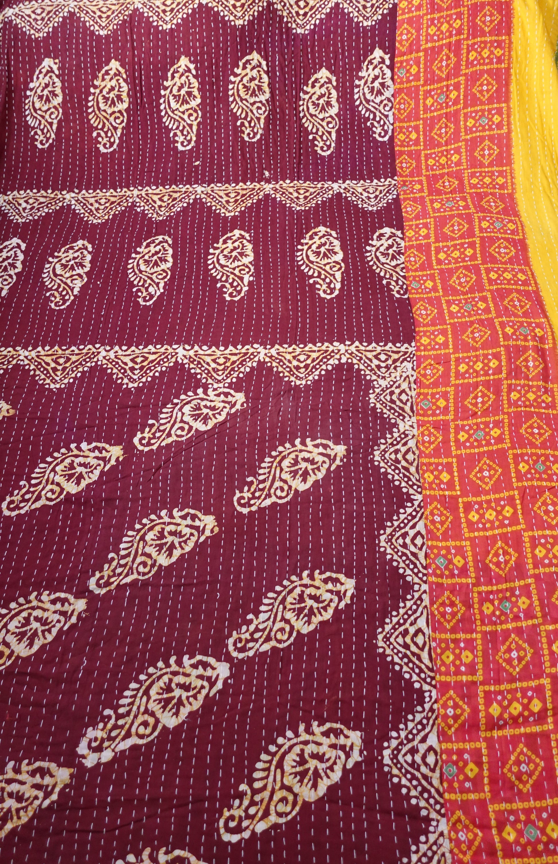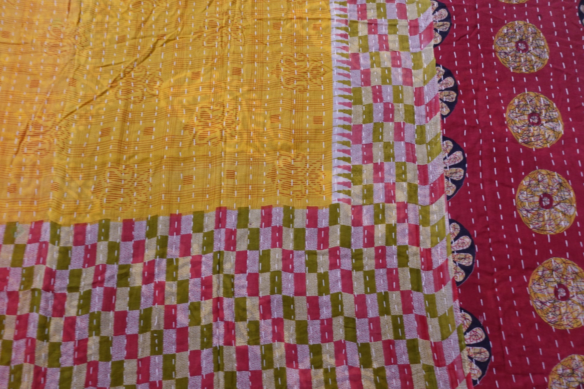 Beautiful, colourful Kantha throw made from recycled vintage saris sewn together with an all over running stitch.